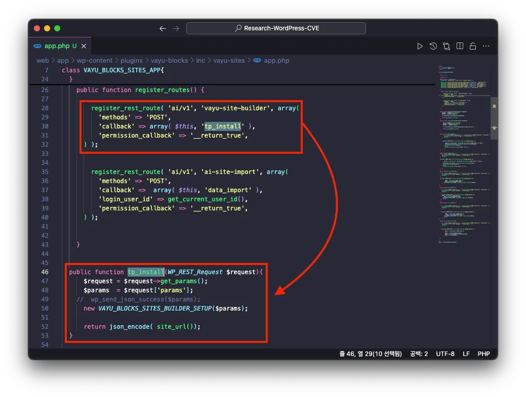 위 요청은 Vayu Blocks 플러그인의 wp-content/plugins/vayu-blocks/inc/vayu-sites/app.php 파일내 tp_install 함수를 호출합니다.