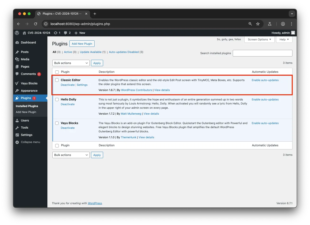 이를 통해 인증되지 않은 공격자가 임의의 플러그인을 설치 및 활성화하여 다른 취약한 플러그인을 내려받아 원격 코드 실행을 수행할 수 있습니다.