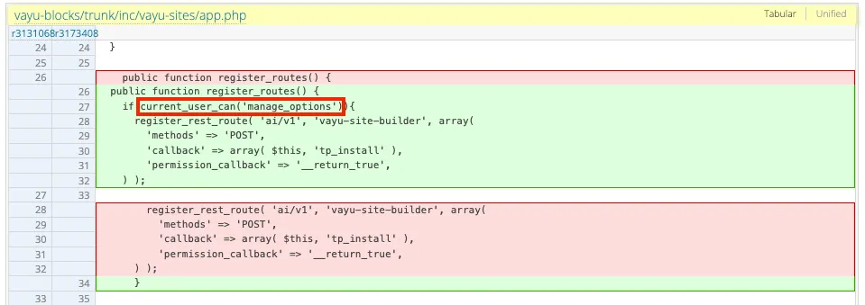 즉시 패치된 내용은 current_user_can('manage_options') 함수를 이용하여 관리자(Administrator) 역할을 가지는 사용자만이 tp_install 함수를 호출하도록 하고 있습니다.