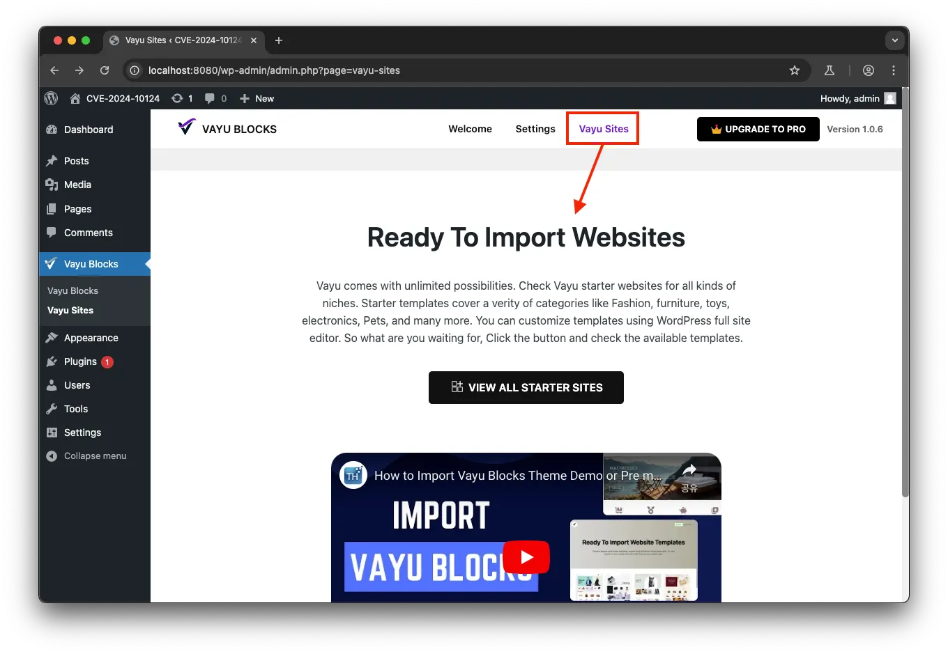 Vayu Blocks 플러그인의 대시보드 메뉴 'Vayu Sites'에서는 해당 플러그인을 사용하여 기본 템플릿을 지정할 수 있습니다.