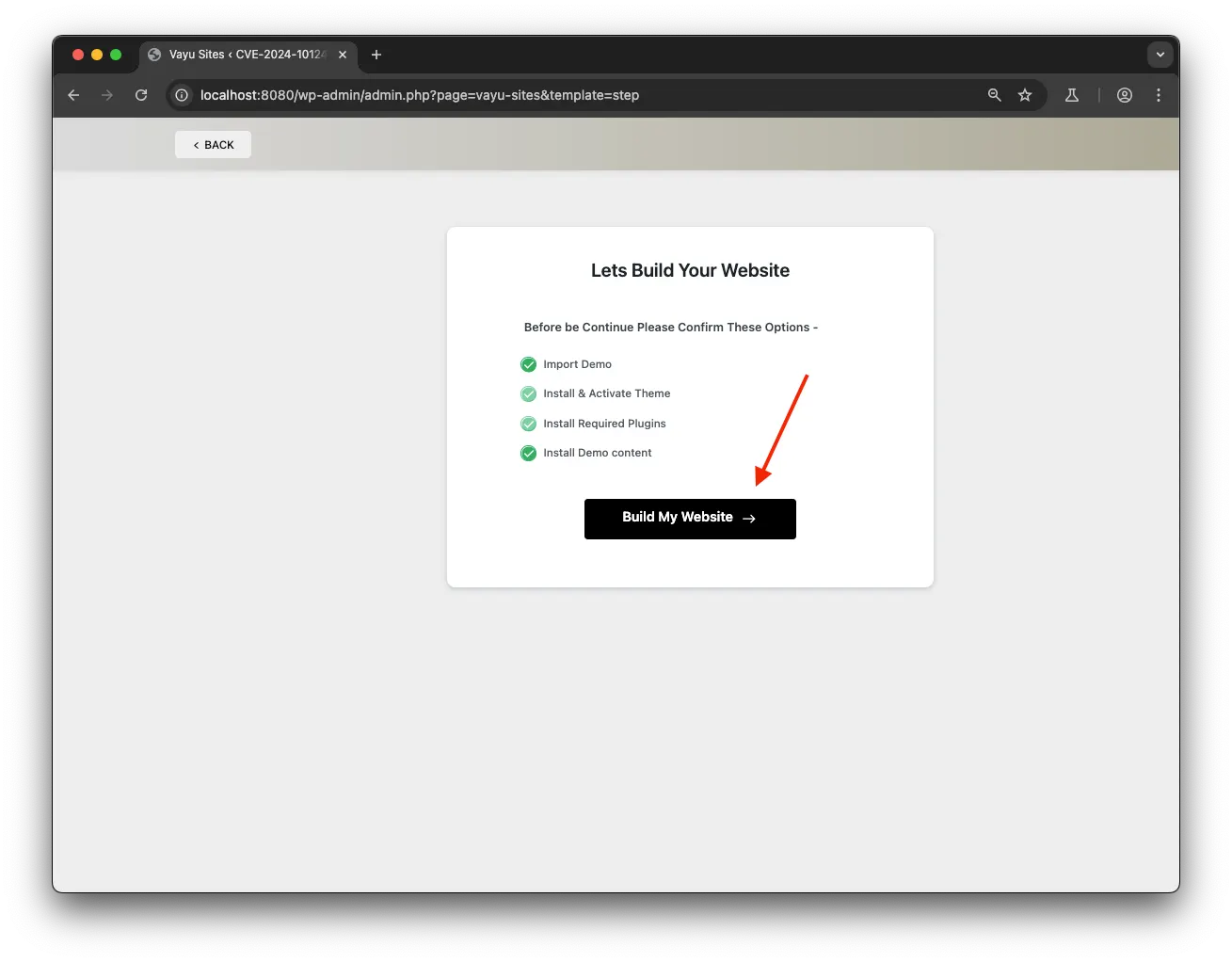 워드프레스 사이트에 템플릿 적용에 필요한 테마 및 플러그인이 설치된다는 확인 페이지가 나타납니다. 이어서 Build My Website 버튼을 클릭하면 설치가 진행됩니다.