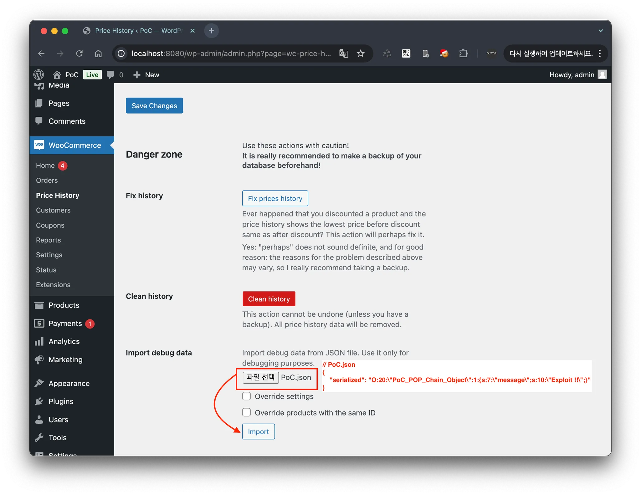 WC Price History for Omnibus 플러그인 2.1.4 버전 이하에서는 WooCommerce 대시보드의 'Price History' 메뉴(/wp-admin/admin.php?page=wc-price-history)에서 'Import debug data' 섹션을 통해 JSON 파일을 업로드할 수 있습니다. 업로드된 JSON 파일은 wc_price_history_import_file 페이로드로 전송되며, JSON 데이터의 'serialized' 키 값에서 PHP Object Injection 취약점이 발생합니다. 이 취약점을 통해 Shop Manager 권한을 가진 공격자는 PHP 객체를 주입할 수 있습니다.