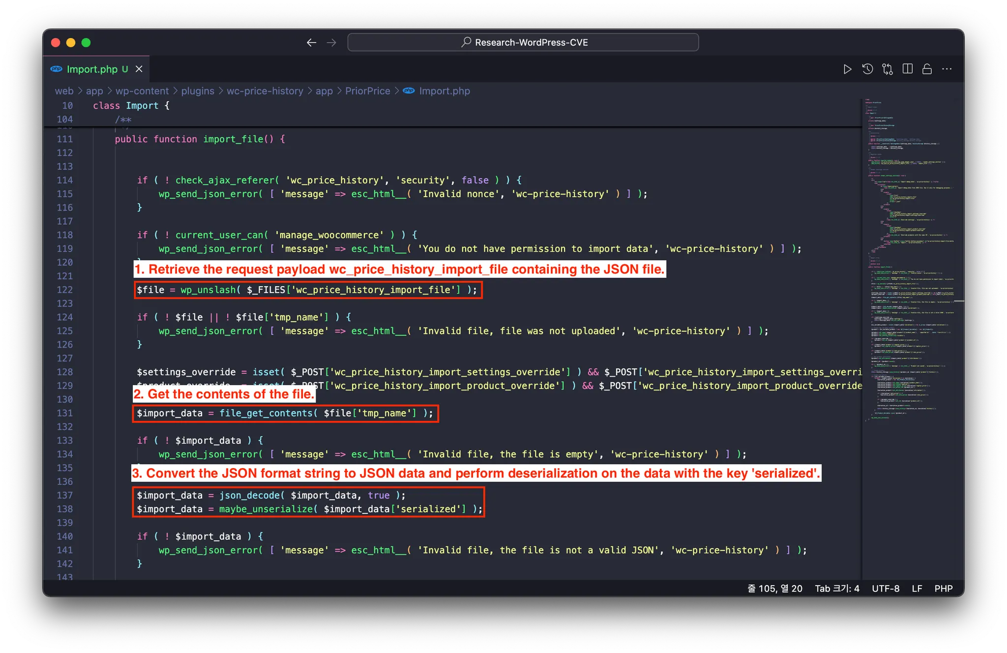 /wp-content/plugins/wc-price-history/app/PriorPrice/Import.php 파일의 Import 클래스에 정의된 import_file() 함수가 실행됩니다. 해당 함수는 Json 파일이 담긴 요청 페이로드 wc_price_history_import_file 를 가져온 뒤, 해당 Json 데이터에 키가 serialized인 데이터를 가져와 함수 maybe_unserialize 를 통해 역직렬화를 수행합니다.