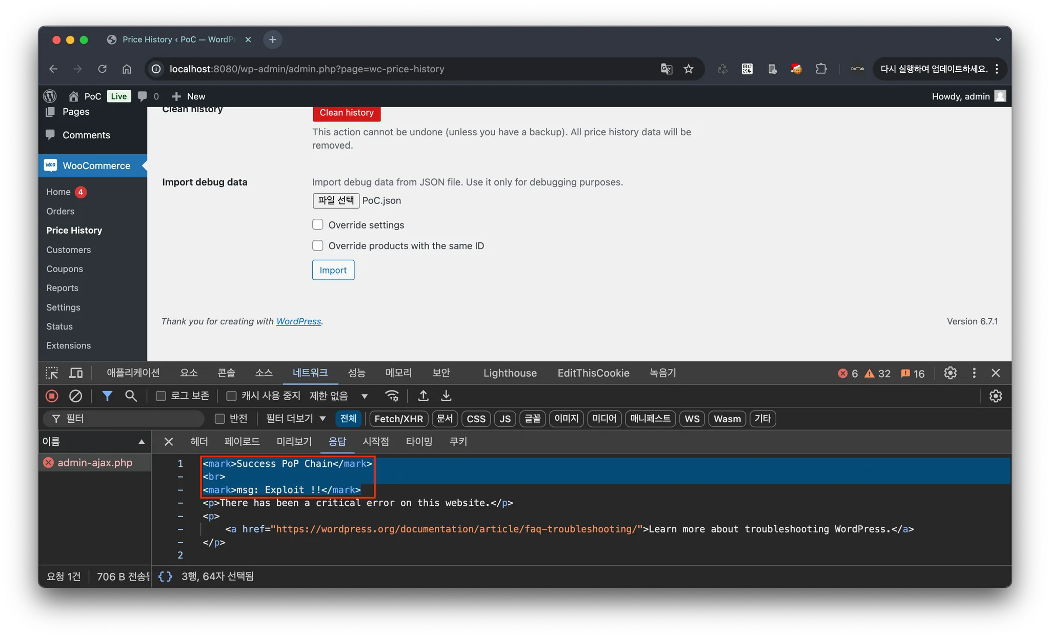 따라서, 요청 페이로드 wc_price_history_import_file 는 Json 형식의 데이터로 해당 데이터에 키가 serialized 인 직렬화된 데이터를 검증 없이 역직렬화하는 과정에서 PHP Object Injection 취약점이 발생하게 됩니다.