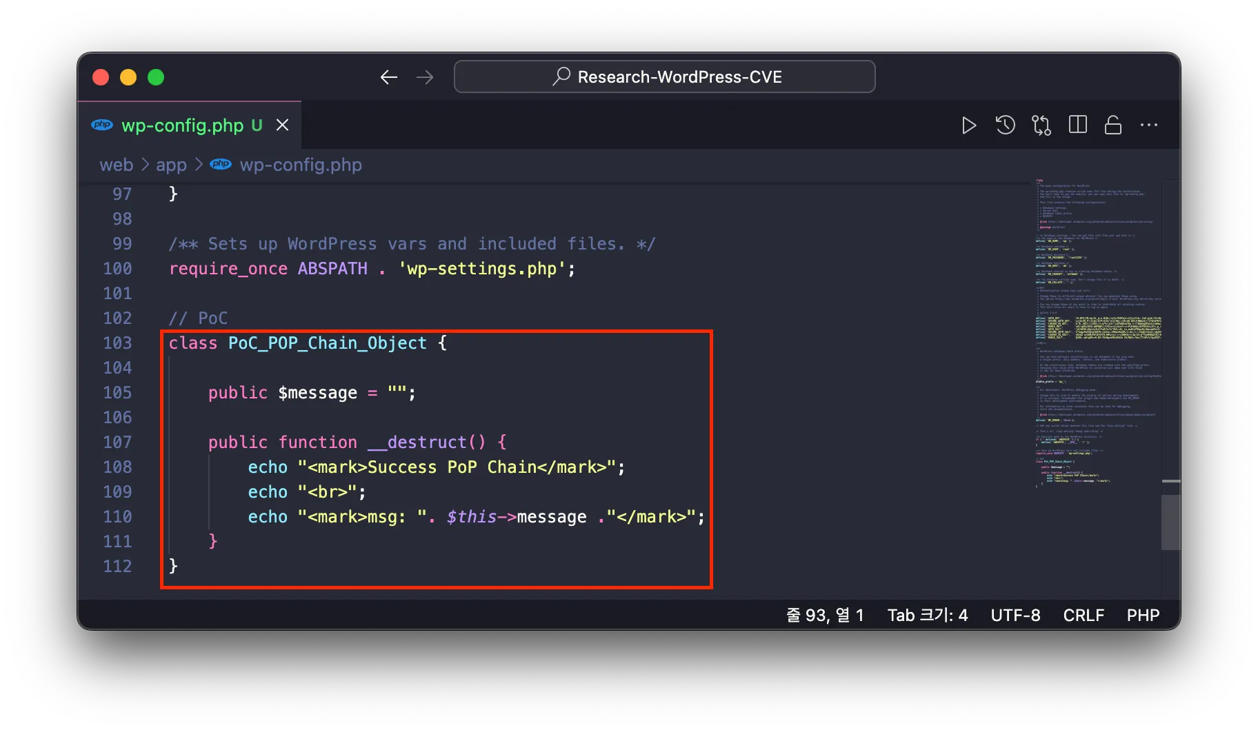 PHP Object Injection 취약점을 테스트하기 위해 아래의 클래스 PoC_POP_Chain_Object 를 wp-config.php 파일 하단에 추가합니다.