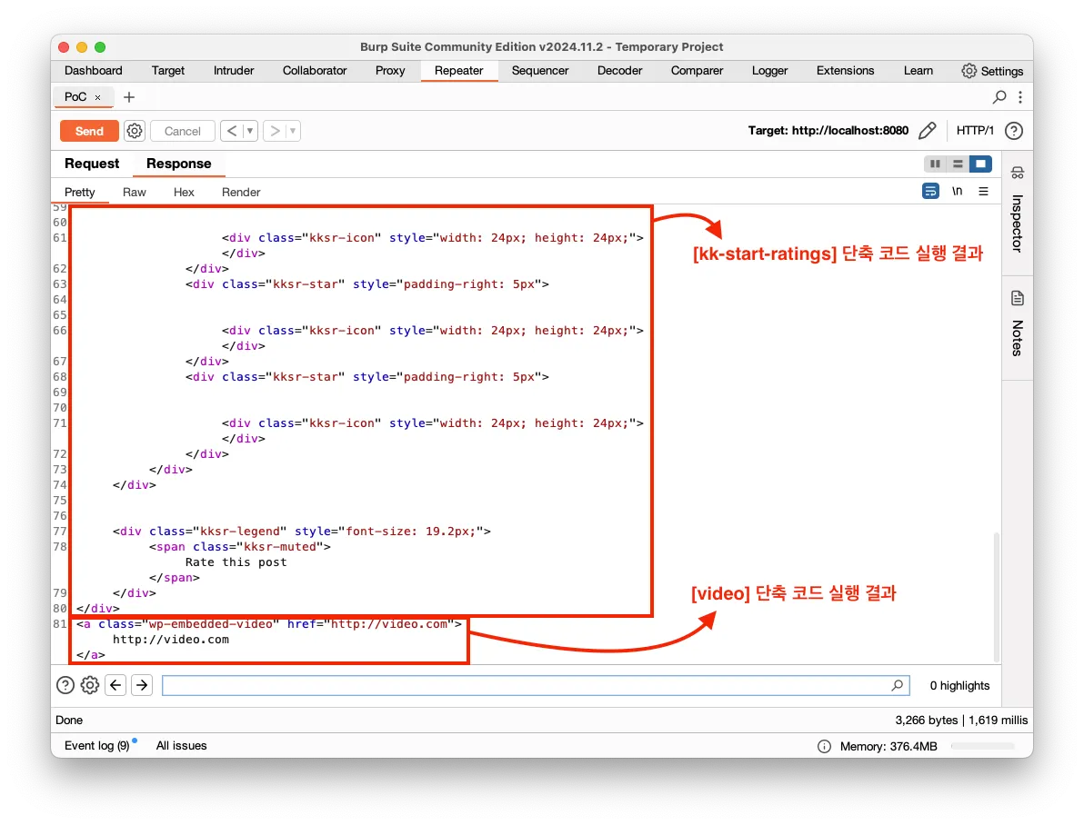 이렇게 생성된 코드는 [kk-start-ratings]와 [video] 두 개의 단축 코드로 구성되며, 이는 do_shortcode 함수의 인자로 전달되어 아래의 응답 데이터를 생성합니다.