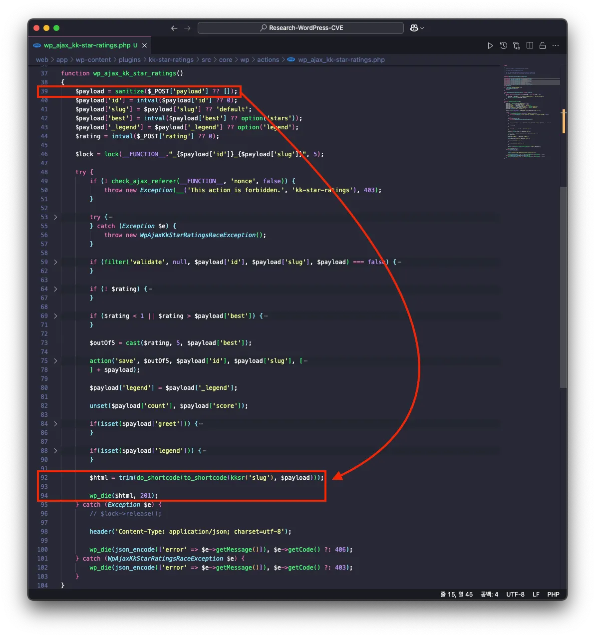wp_ajax_kk_star_ratings 함수의 코드 구문을 살펴보면, line 39에서 변수 $payload에 요청 페이로드 payload의 값을 초기화합니다. 이후 line 92에서 이 값을 함수 to_shortcode의 두 번째 인자로 전달하고, 그 결과를 다시 do_shortcode의 인자로 전달한 뒤 해당 함수 do_shortcode 의 실행 결과를 HTTP 상태코드 201과 함께 응답합니다.