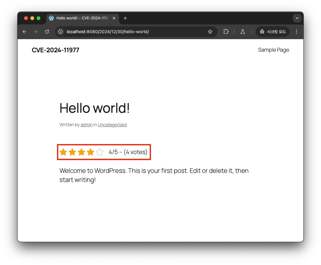 CVE-2024-11977 취약점은 WordPress 플러그인 The The kk Star Ratings - Rate Post & Collect User Feedbacks의 5.4.10 버전 이하에서 발생하는 임의 단축 코드(do_shortcode) 실행 취약점입니다.