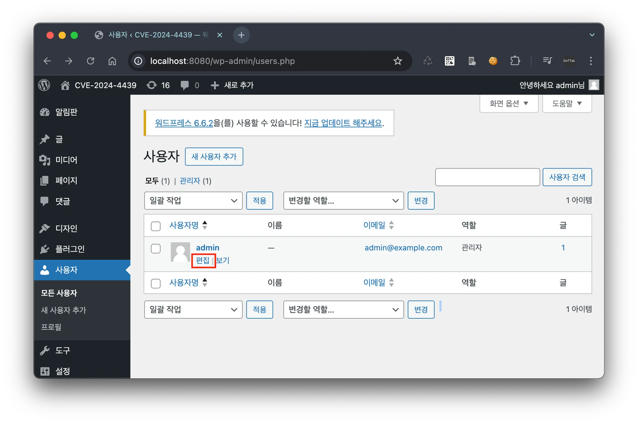 그럼 방금 로그인한 사용자의 정보가 나오는데 해당 사용자의 ‘편집’으로 이동합니다.