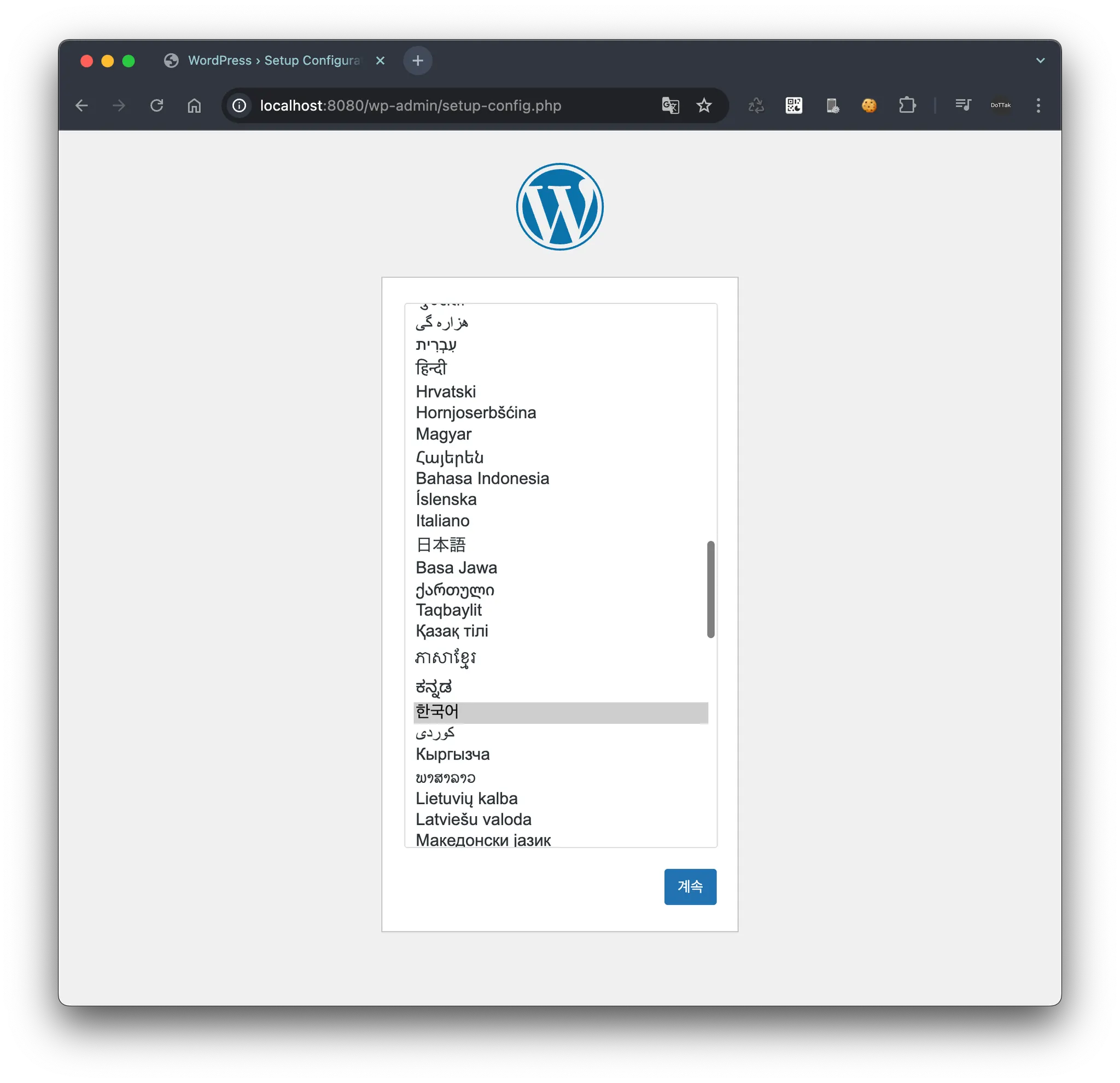 그 다음 브라우저를 이용하여 http://localhost:8080 로 이동한 뒤, WordPress를 설치합니다.