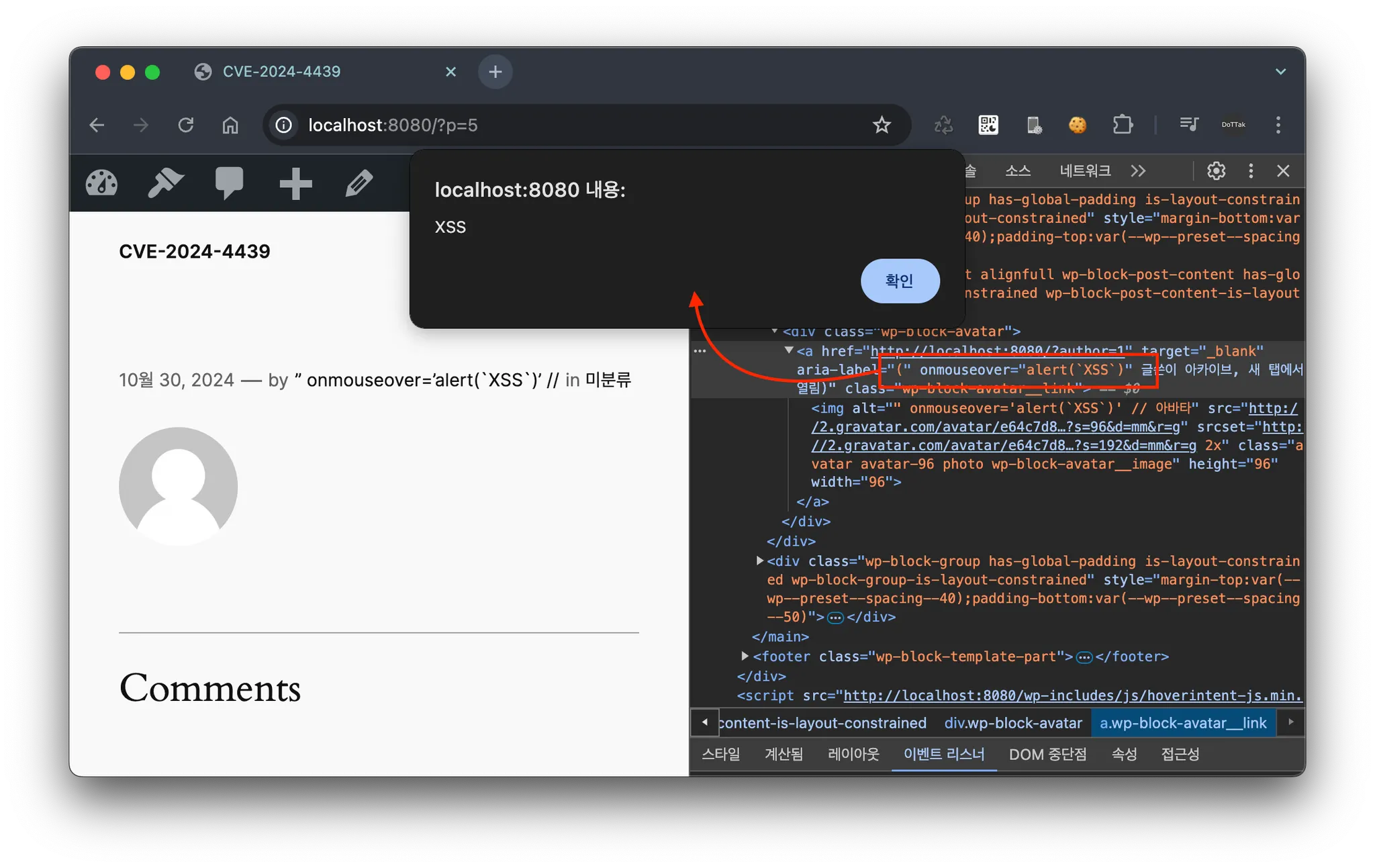 이후 작성된 글로 페이지를 이동한 뒤, 아바타 블록에 마우스를 가져다 대면(onmouseover) 다음과 같이 XSS 취약점이 발생되어 alert 이 발생됩니다.