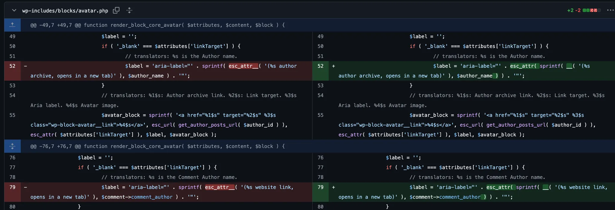 변경된 코드를 살펴보면 다음과 같이 sprintf 함수를 먼저 호출하여 변수 $author_name 를 서식 문자열 %s 에 삽입한 뒤, esc_attr 함수의 인자로 전달하고 있습니다.