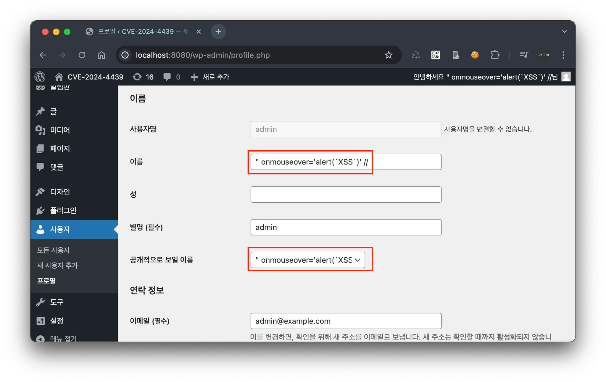 이후 이름 부분에 " onmouseover='alert(`XSS`)' // 를 입력하고, 공개적으로 보일 이름 에 방금 입력한 내용을 선택하고 프로필을 업데이트합니다.