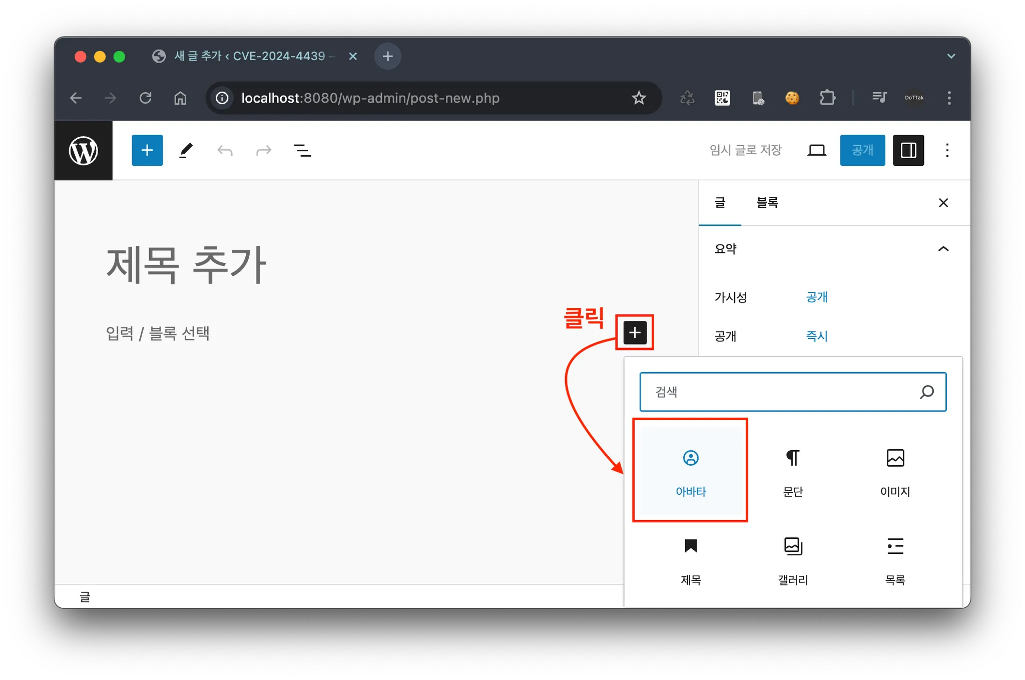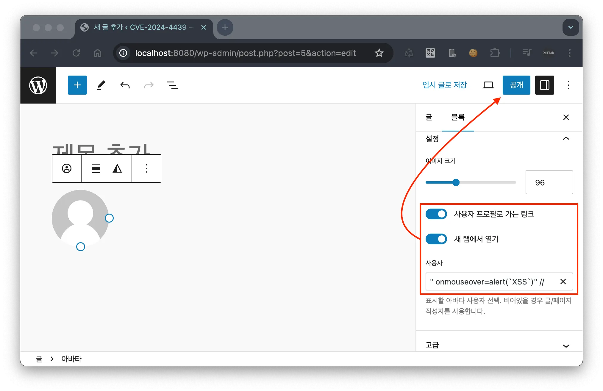 새 글 작성 시 아바타 블록을 추가하고, 해당 블록의 설정을 '사용자 프로필 링크' 및 '새 탭에서 열기'로 지정하면 사용자의 표시 이름이 출력됩니다. 이때 출력되는 값이 적절히 이스케이프 처리되지 않아 XSS 취약점이 발생합니다.