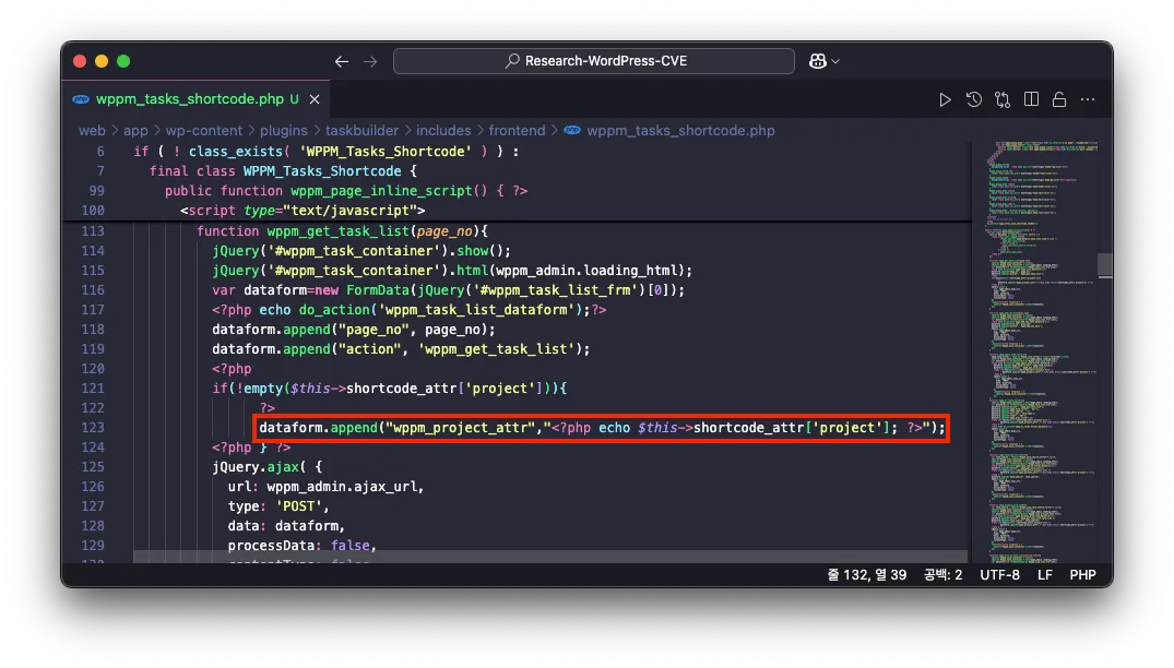 이후 wppm_page_inline_script 함수는 Javascript 코드를 동적으로 생성하는데, 이 과정에서 PHP의 echo 함수를 통해 this->shortcode_attr['project'] 값이 Javascript 코드에 포함되는 것을 확인할 수 있습니다.