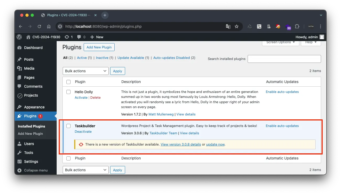 CVE-2024-11930 취약점은 Taskbuilder – WordPress Project & Task Management plugin 플러그인(이하, Taskbuilder 플러그인) 버전 3.0.6 이하에서 발생하는 저장형 크로스 사이트 스크립팅 취약점입니다.