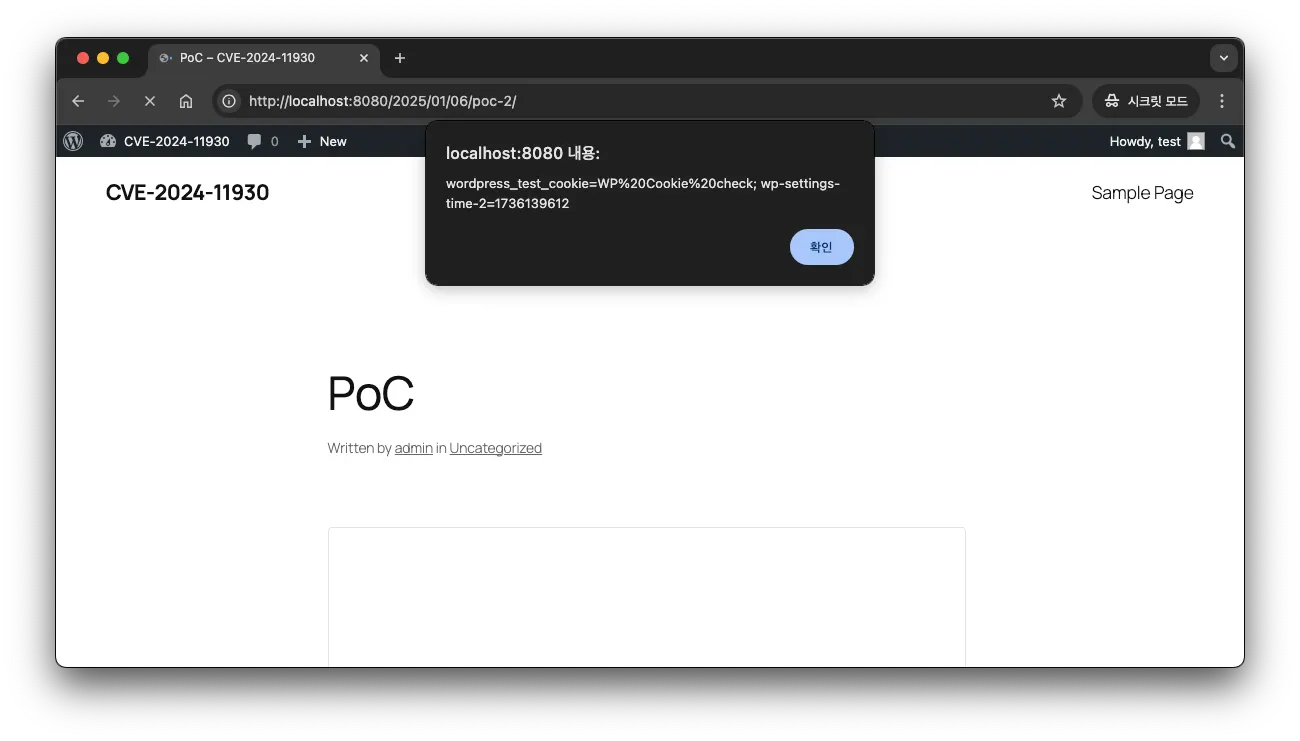 이후 해당 단축 코드가 포함된 글에 접속하면 크로스 사이트 스크립팅 취약점이 발생하는 것을 확인할 수 있습니다.