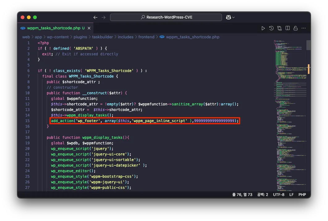 Taskbuilder 플러그인의 단축 코드가 포함된 페이지나 게시글에 접근하면 /wp-content/plugins/taskbuilder/includes/frontend/wppm_tasks_shortcode.php 파일의 WPPM_Tasks_Shortcode 클래스에서 __construct 메서드가 실행되며, 이후 메서드의 로직에 따라 wppm_page_inline_script 함수가 호출됩니다.