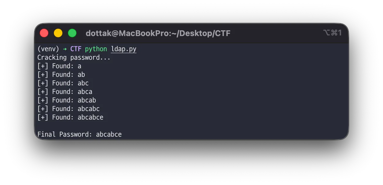 이에 다시 어드민 계정 'adminldaptest’ 의 비밀번호를 알아내기 위해 조금전 LDAP Injection 기법을 이용한 아래의 스크립트를 이용했습니다.