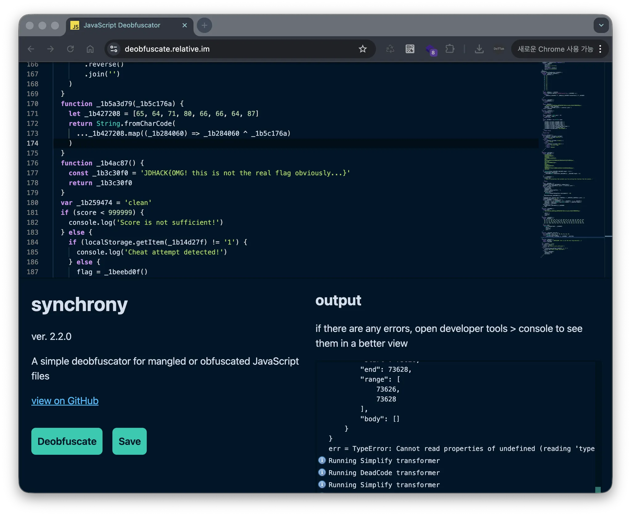 이후 해당 스크립트의 결과에서 플래그가 출력되는 것을 확인했습니다.