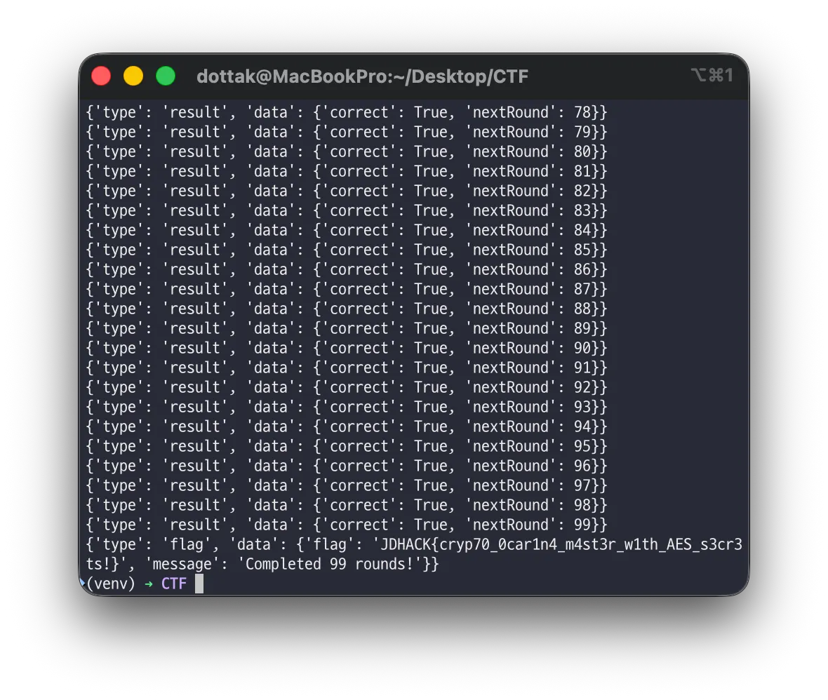 위 스크립트 코드를 실행하면 다음과 같이 플래그가 출력되는 것을 확인할 수 있습니다.