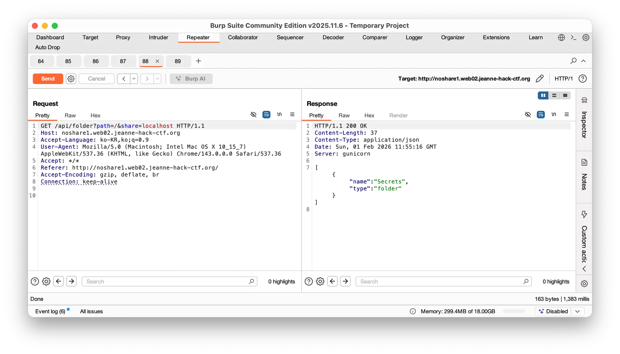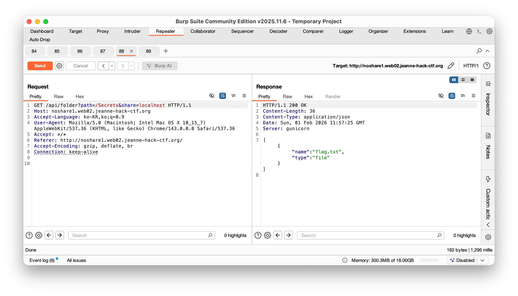 이때, API /api/folder 의 URL 파라미터 share 에 localhost 를 전달했을 때, 다음과 같이 Secrets 폴더가 조회되는 것을 확인했습니다.