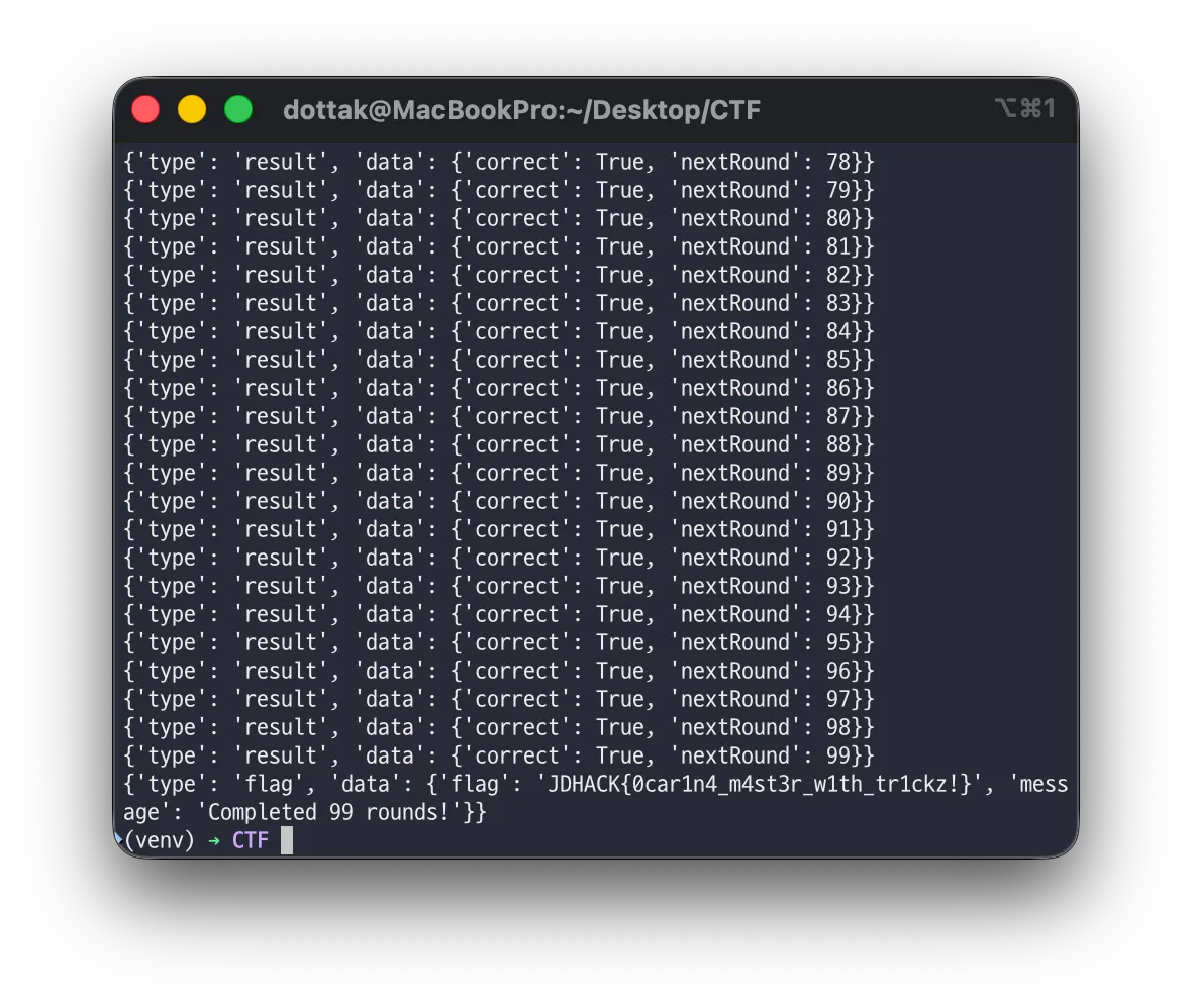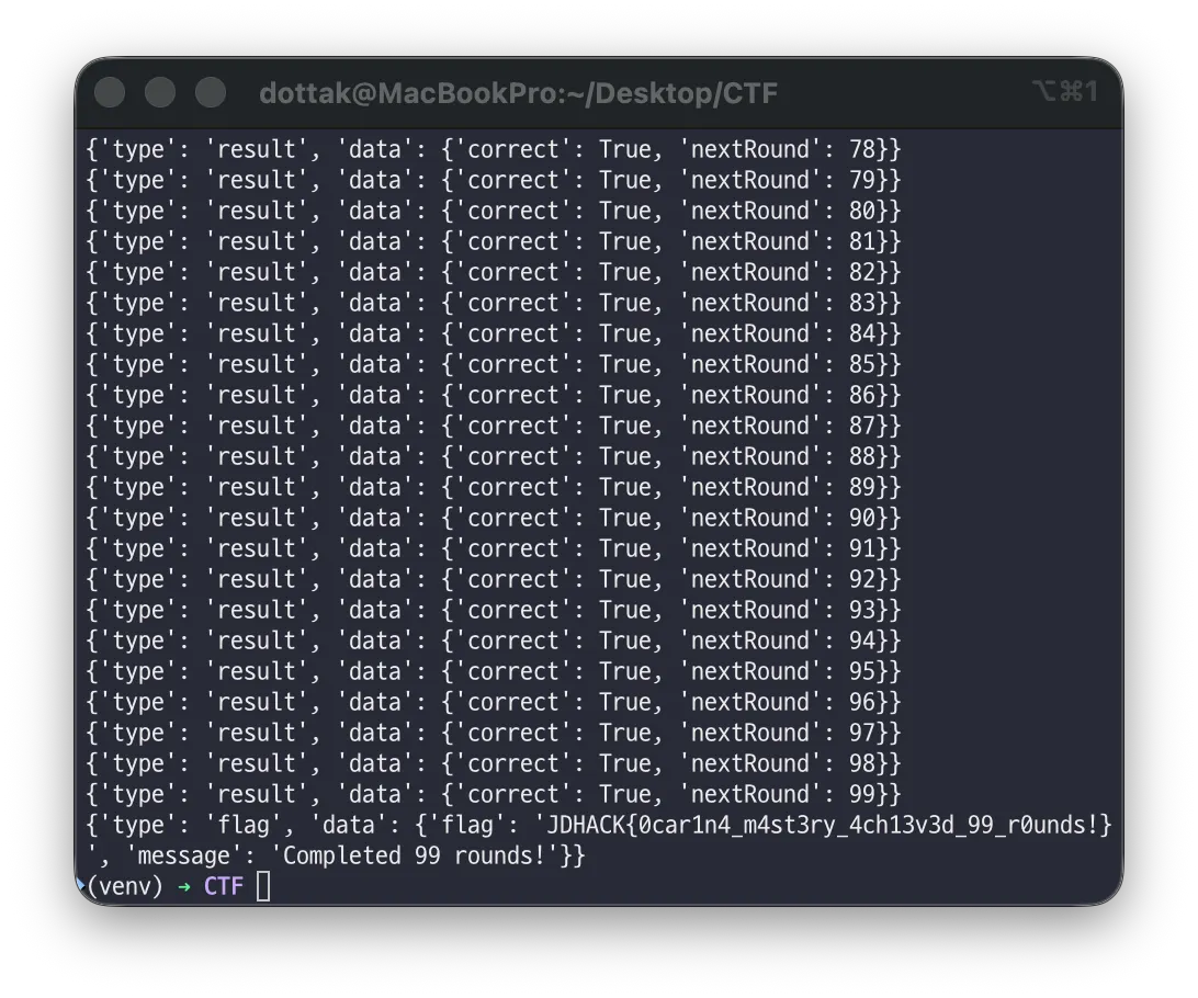 따라서, 웹 소켓 서버가 전달하는 데이터를 클라이언트가 동일하게 전달하고 최종 라운드가 99까지 있으므로 서버로부터 전달되는 데이터를 99번까지 수행한다면 플래그가 나오는 문제로 추측됩니다.