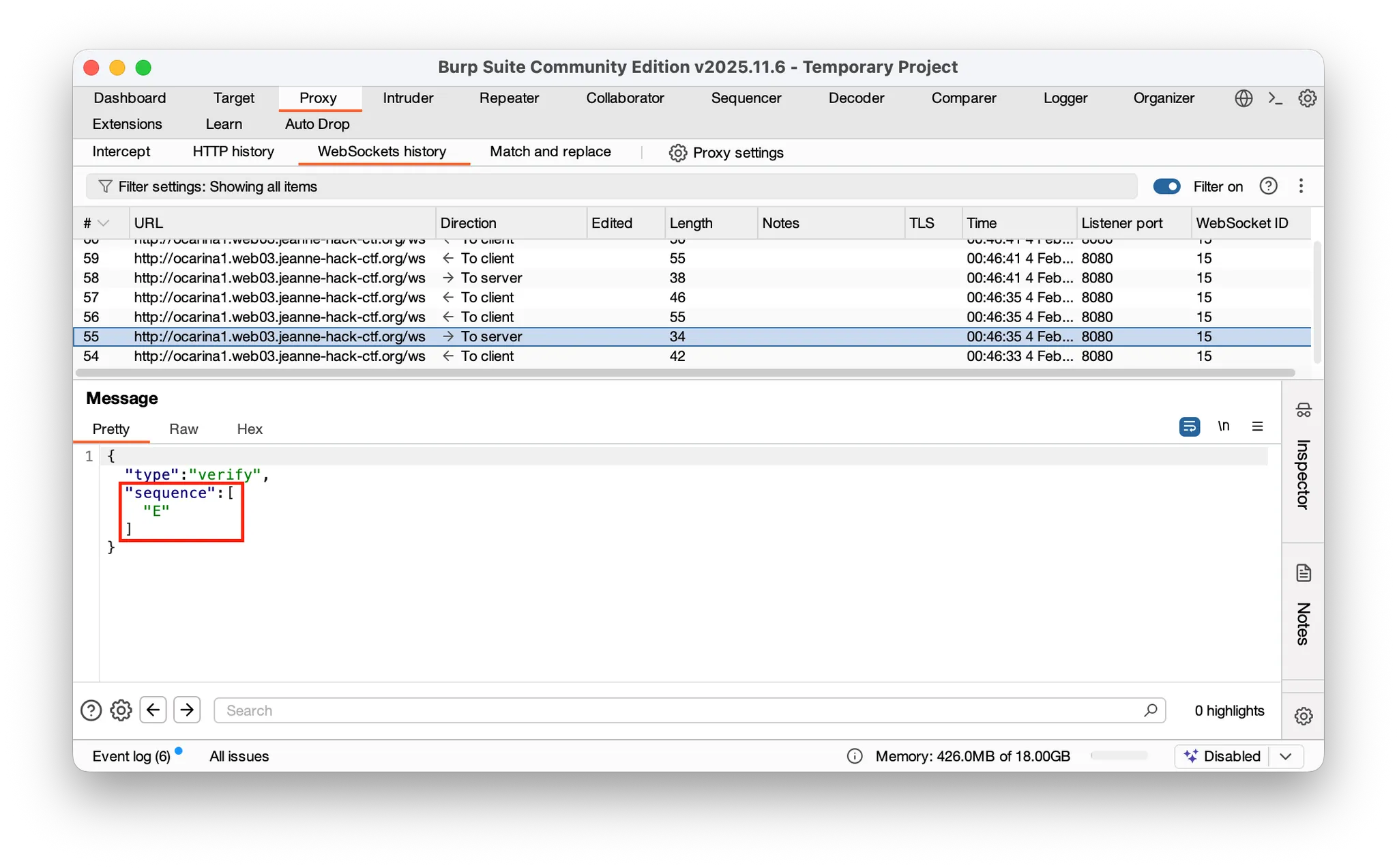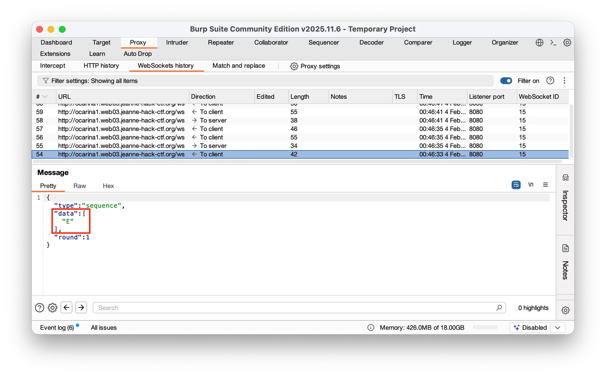 해당 음표를 클라이언트가 정확하게 따라할 경우 다시 웹 소켓 서버로 동일한 데이터("sequence": ["E"])를 전송하는 것을 확인했습니다.