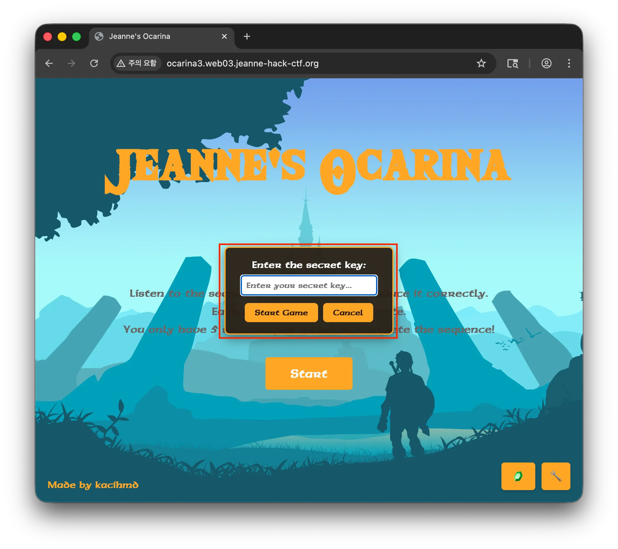 Ocarina - Level 3 에서는 ‘Start’ 버튼 클릭 시 secret key를 입력하라는 폼이 등장합니다.