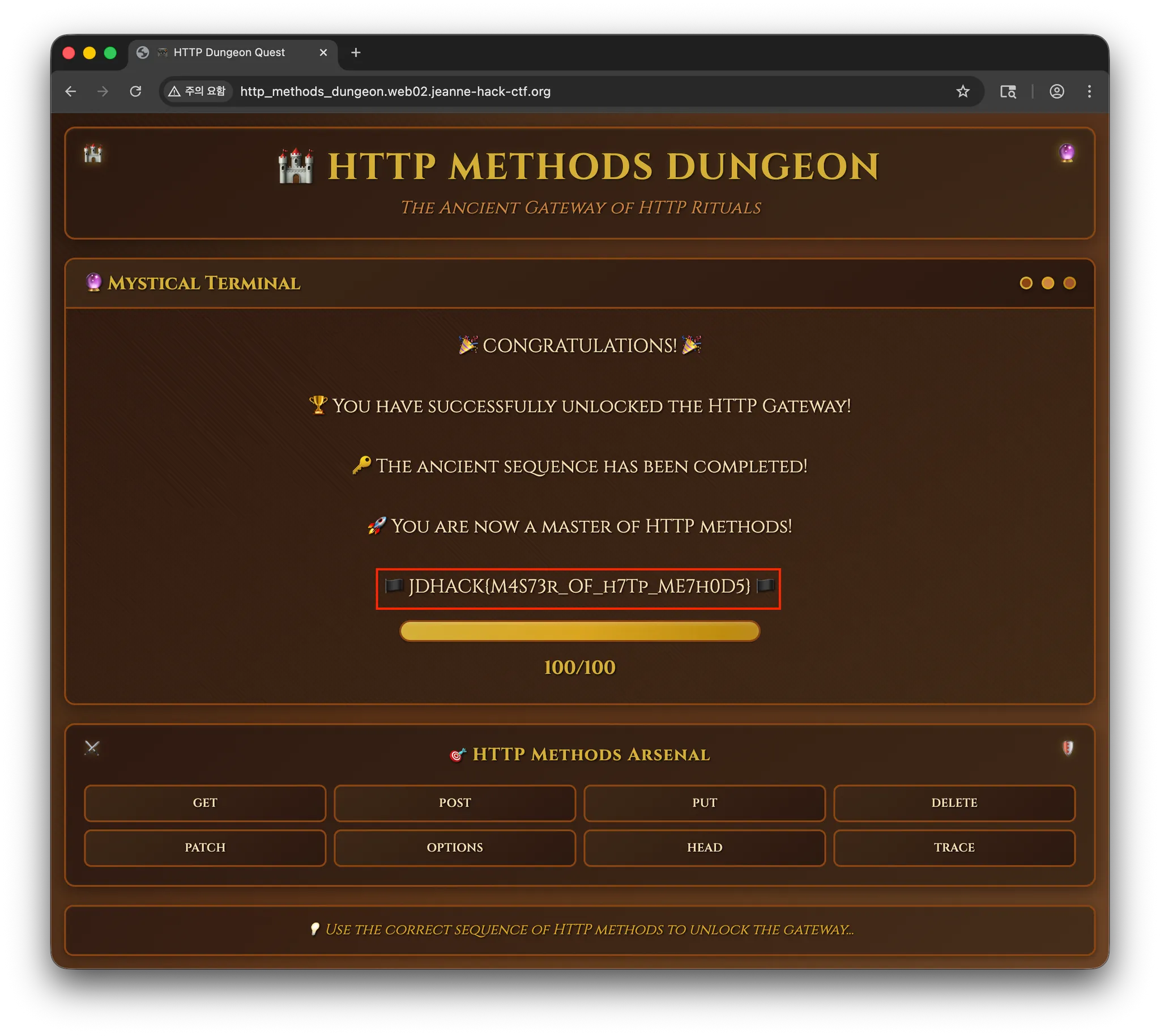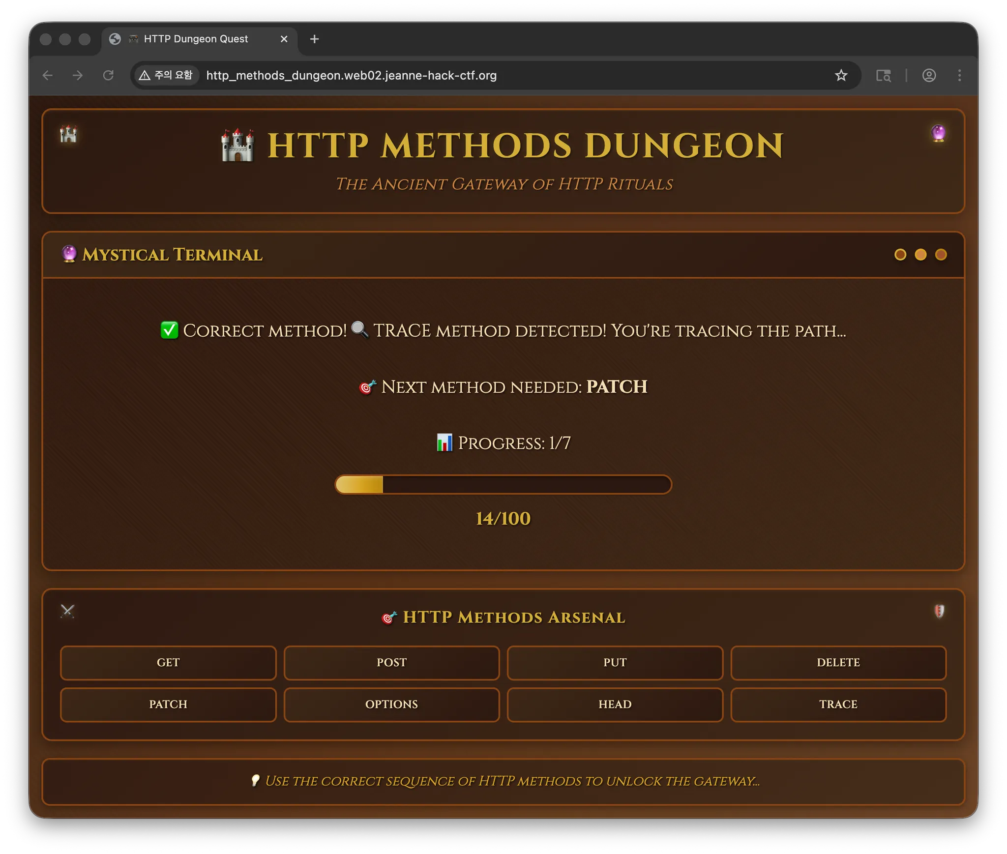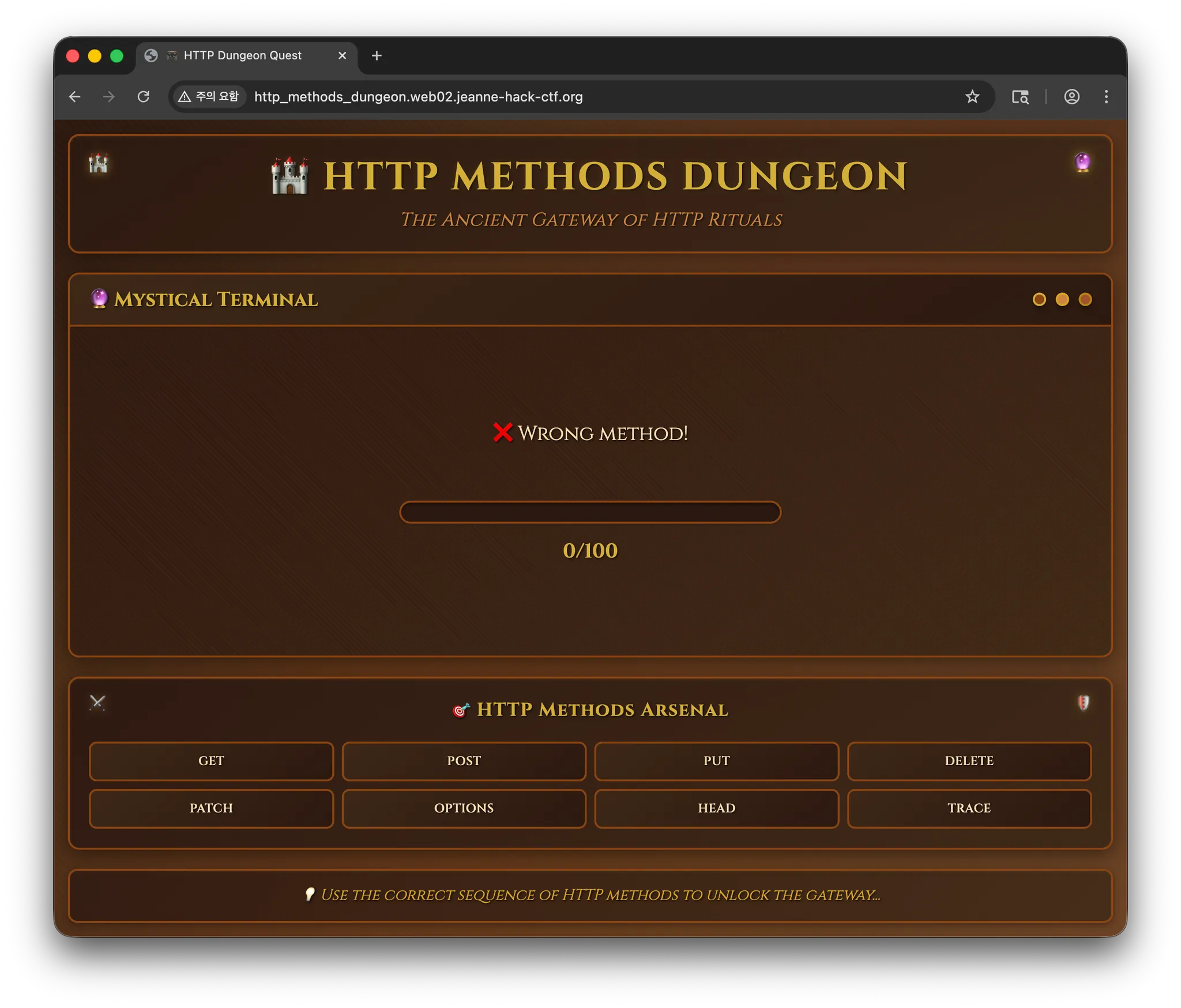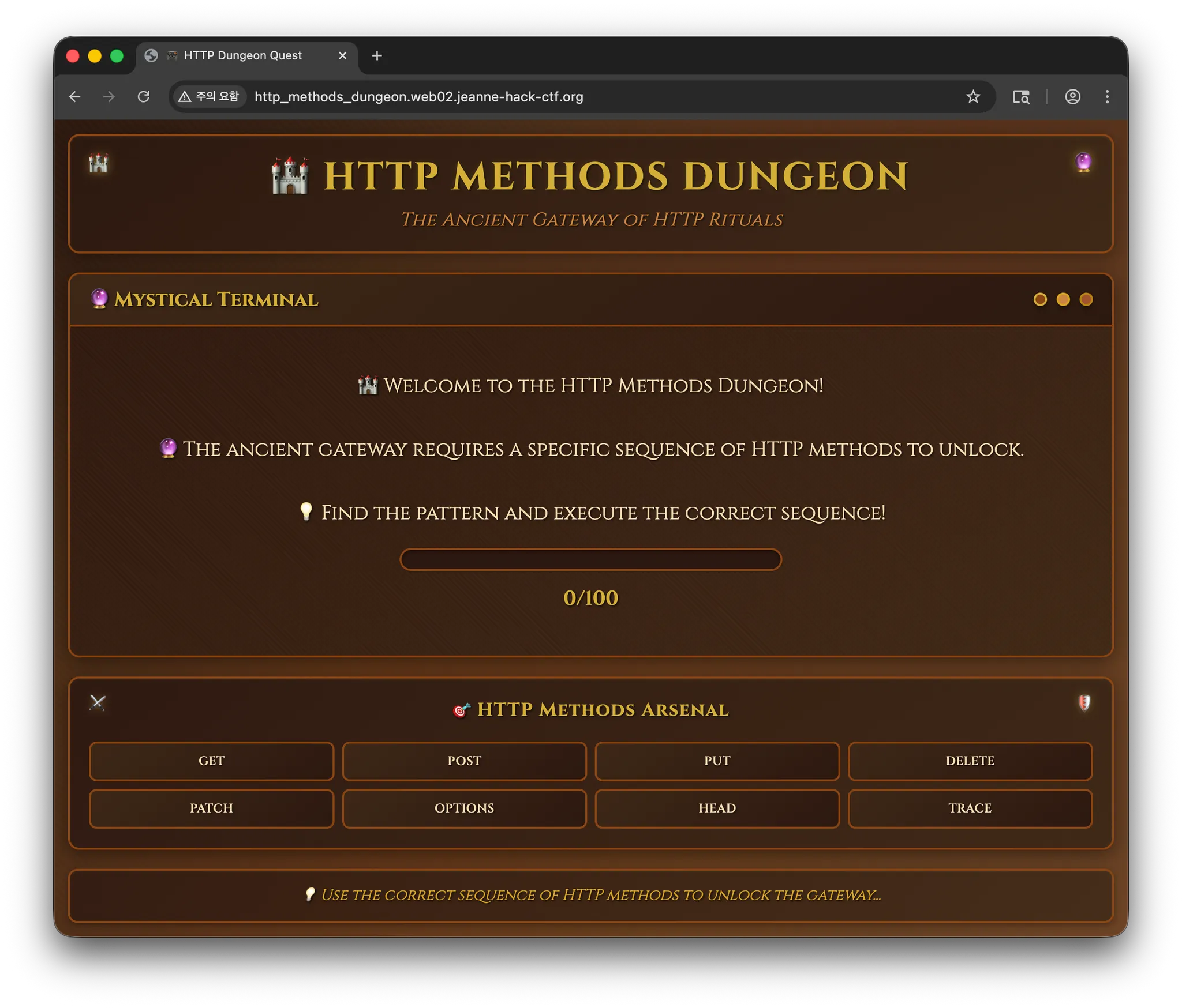 문제에서 제공하는 URL에 접속하면 다음과 같이 HTTP 메서드 순서를 따라야 한다며 패턴을 찾아 올바른 순서를 실행하라고 나와있습니다.