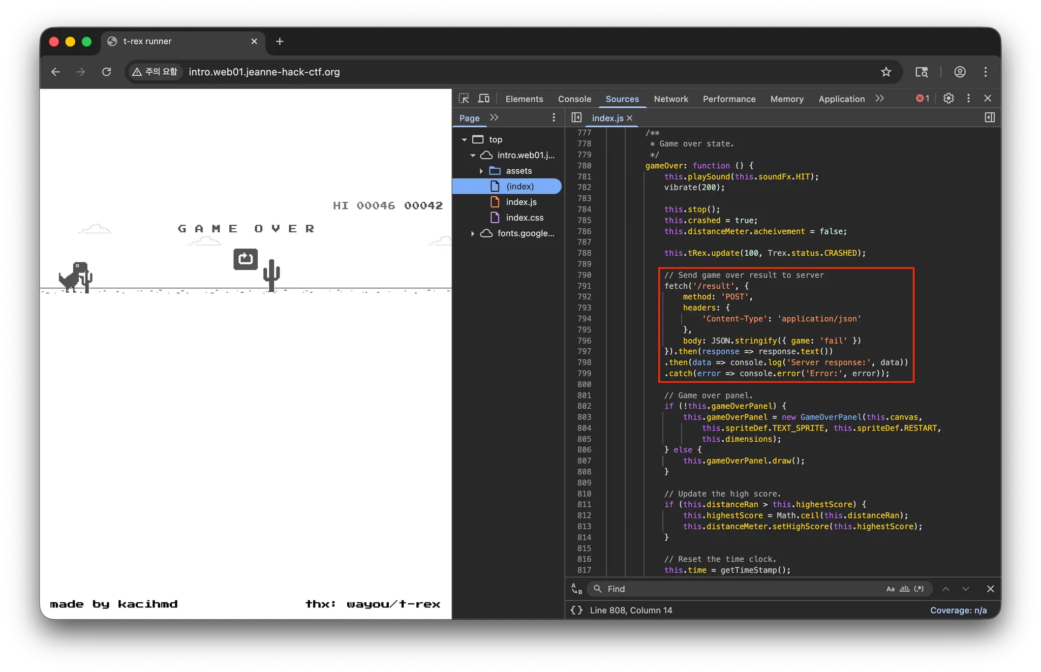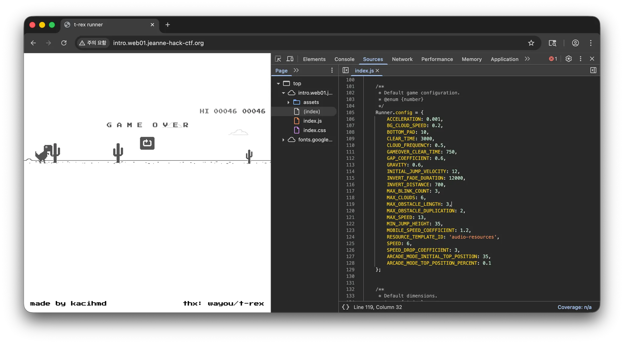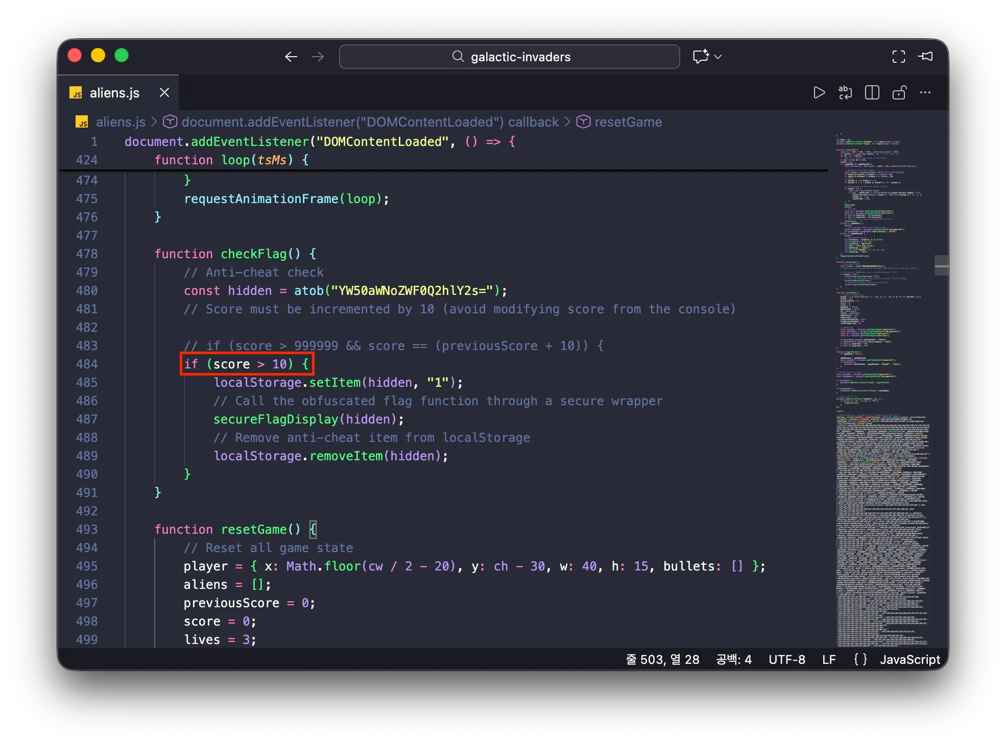 위 문제 URL의 소스코드를 살펴보니 index.js 에서 게임과 관련된 소스코드를 확인할 수 있었습니다.
