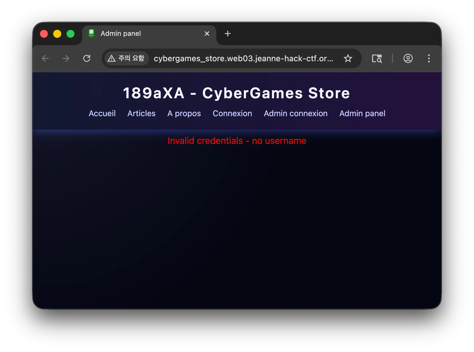 여기서 Admin panel 메뉴로 이동하면 ‘no username’이 나오게 되는데, 앞서 살펴본 새로운 어드민 로그인 폼 요청을 수행해야 하는 것으로 판단됩니다.
