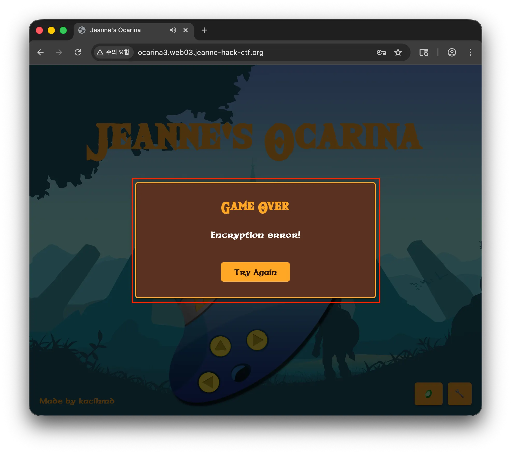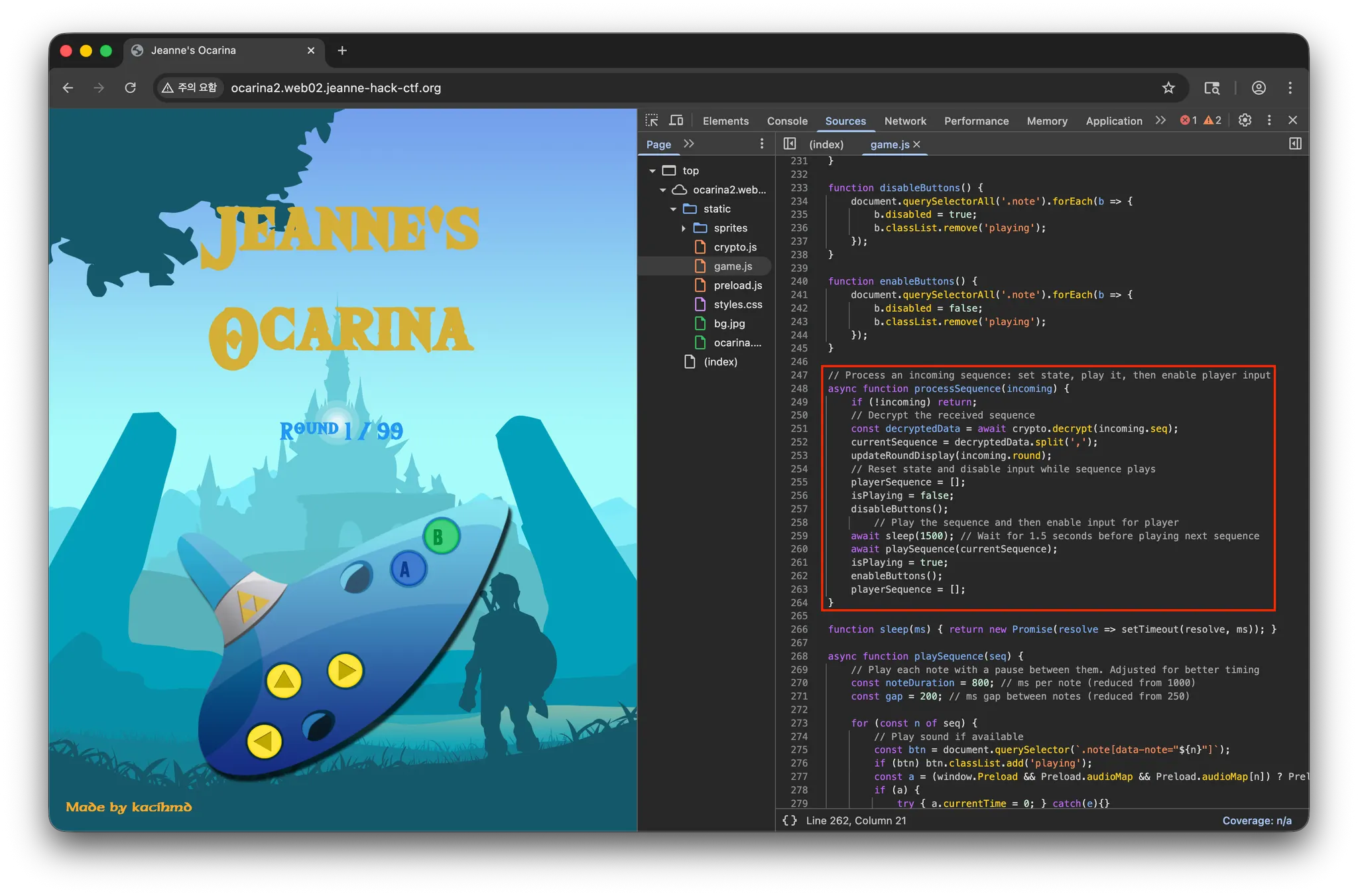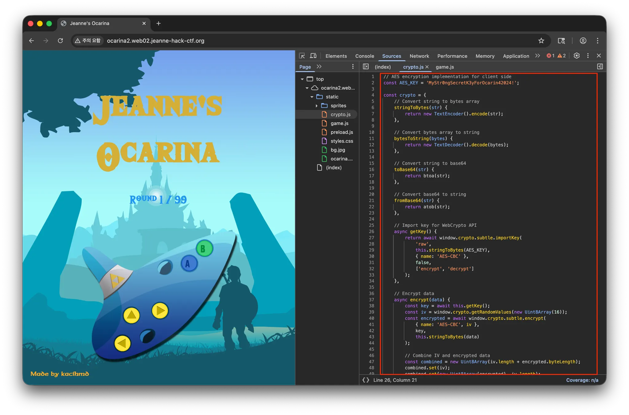앞서 풀었던 문제 ‘Ocarina -Level 1’과 동일한 형태의 문제이지만, 해당 문제는 서버가 클라이언트에게 음표 데이터를 암호화된 데이터로 전달하고 있습니다.