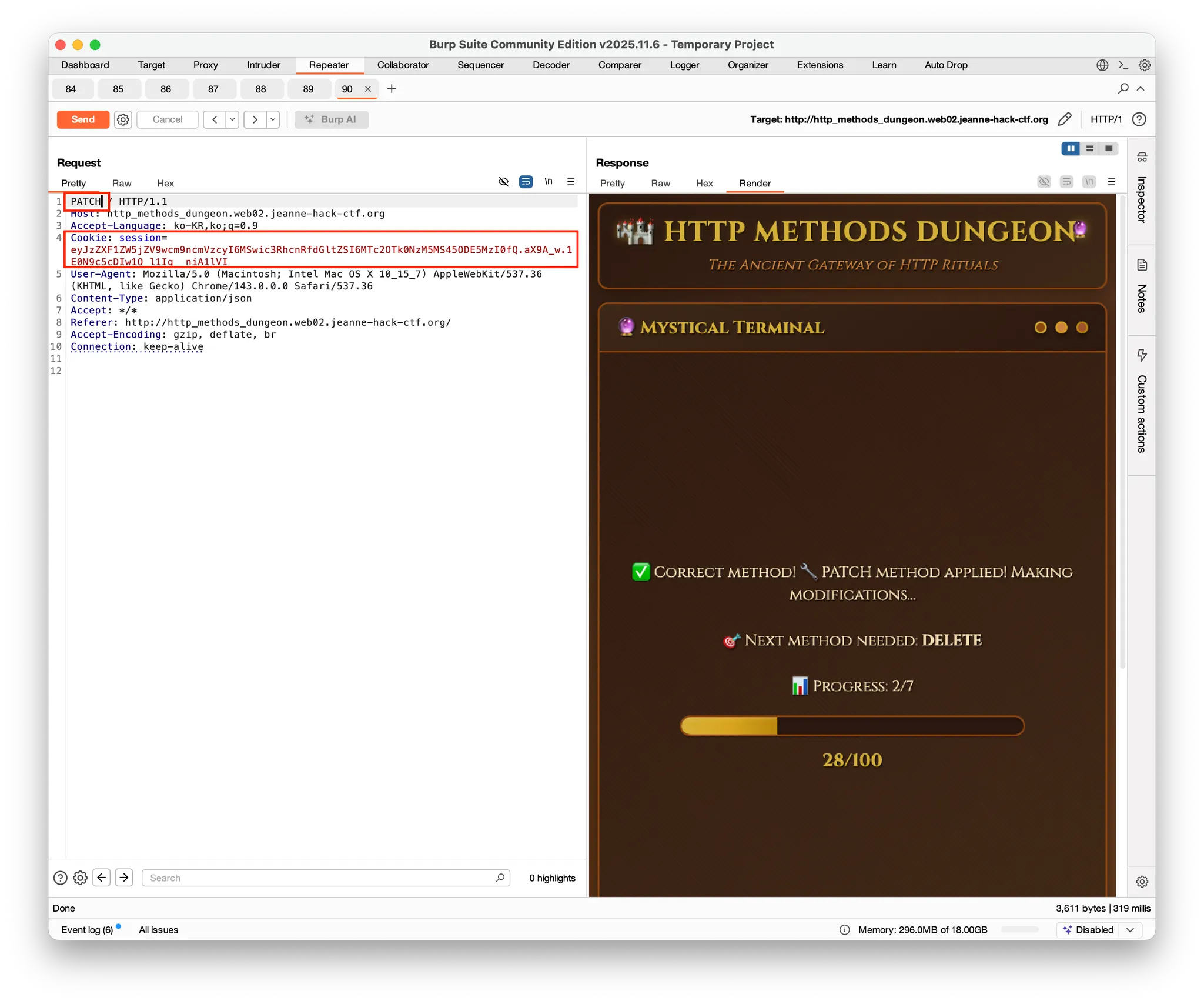 이에 다음 메서드인 PATCH 와 새로 응답된 세션 쿠키 session 을 요청하면 다음과 같이 다음 순서의 메서드 정보를 확인할 수 있습니다.