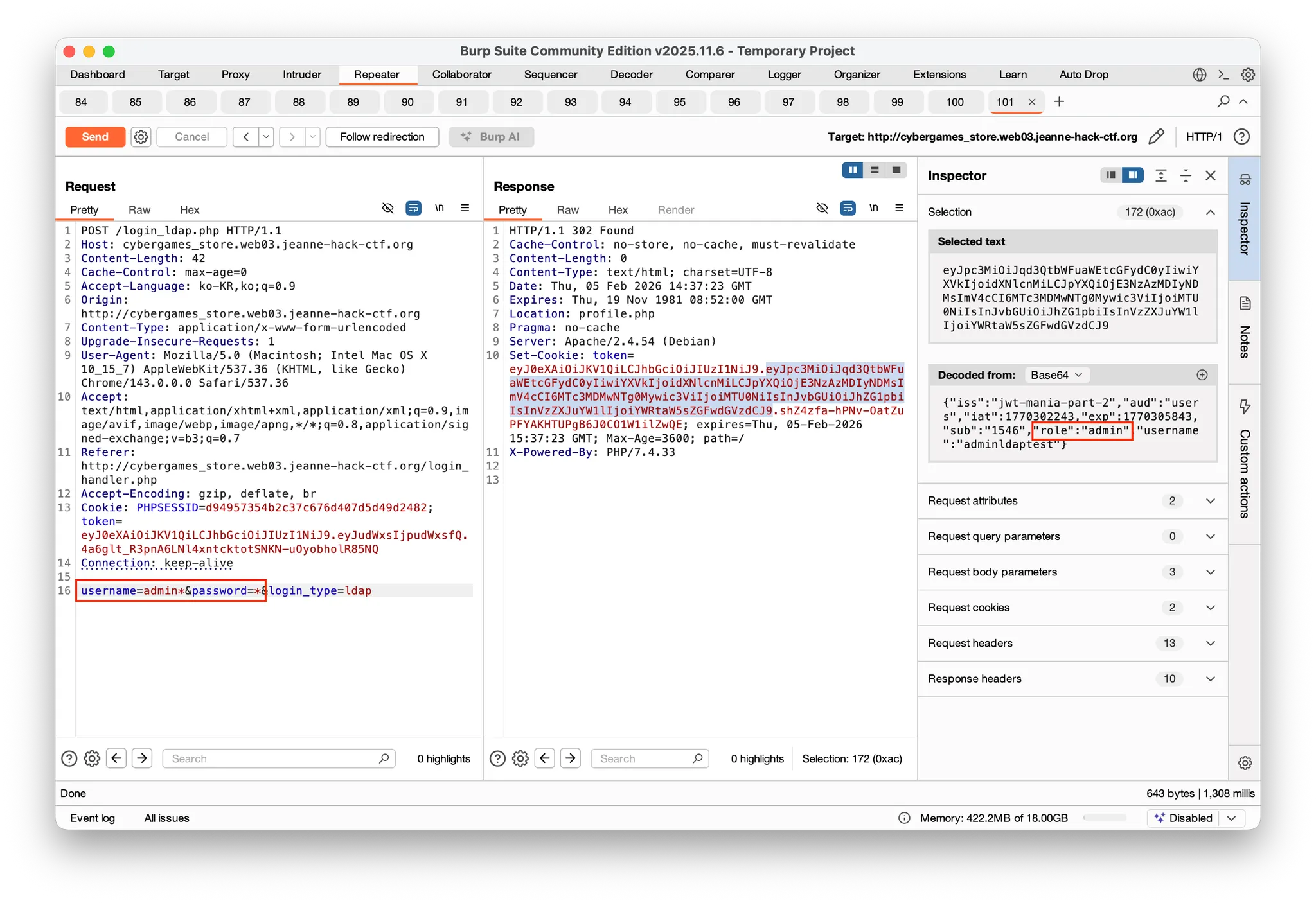 이때, JWT 페이로드의 role 값이 ‘user’ 로 나와있어서 어드민 계정으로 로그인하기 위해 username 에 ‘admin*’ 을 입력하고 password 에 ‘*’를 입력하여 다시 로그인을 수행하니 다음과 같이 role 이 ‘admin’ 이고 username 이 ‘adminldaptest’인 계정의 인증 토큰을 획득할 수 있었습니다.