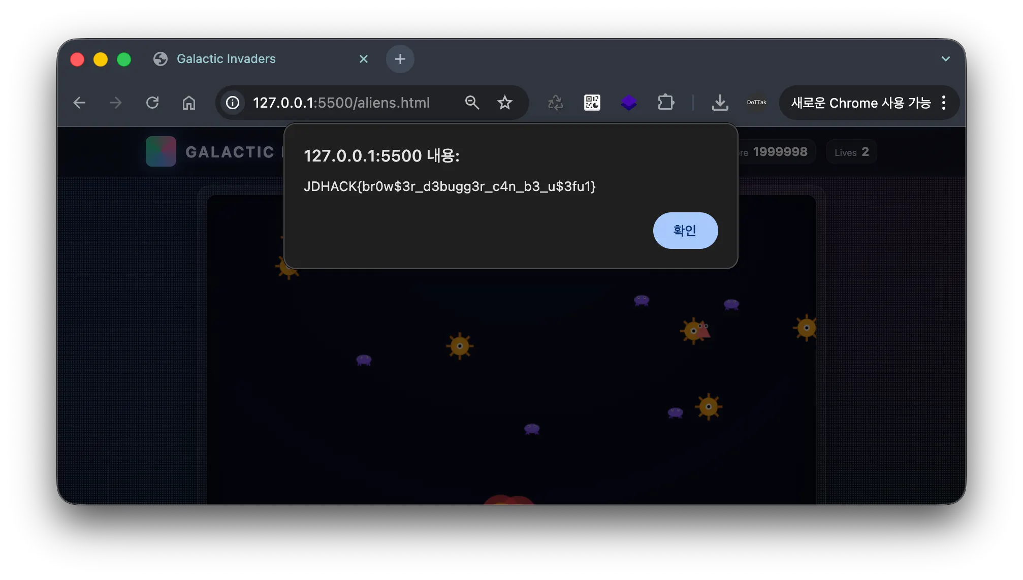 이후 score += 10; 코드를 score += 999999; 으로 변경하고 플레이를 수행했는데, 점수만 늘어나고 플래그는 노출되지 않고 있습니다.