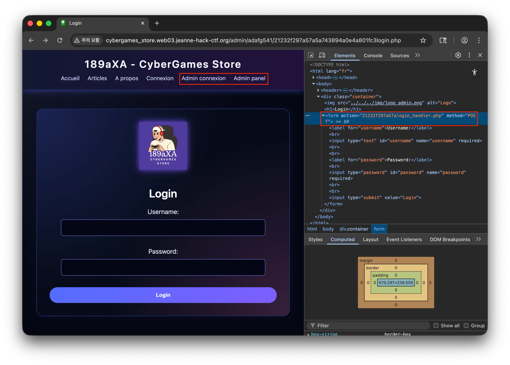 해당 admin/adafg541/21232f297a57a5a743894a0e4a801fc3login.php 요청을 수행하면 다음과 같이 네비게이션 메뉴에 어드민 메뉴가 조회되고 새로운 어드민 로그인 폼 요청(21232f297a57alogin_handler.php)이 조회됩니다.