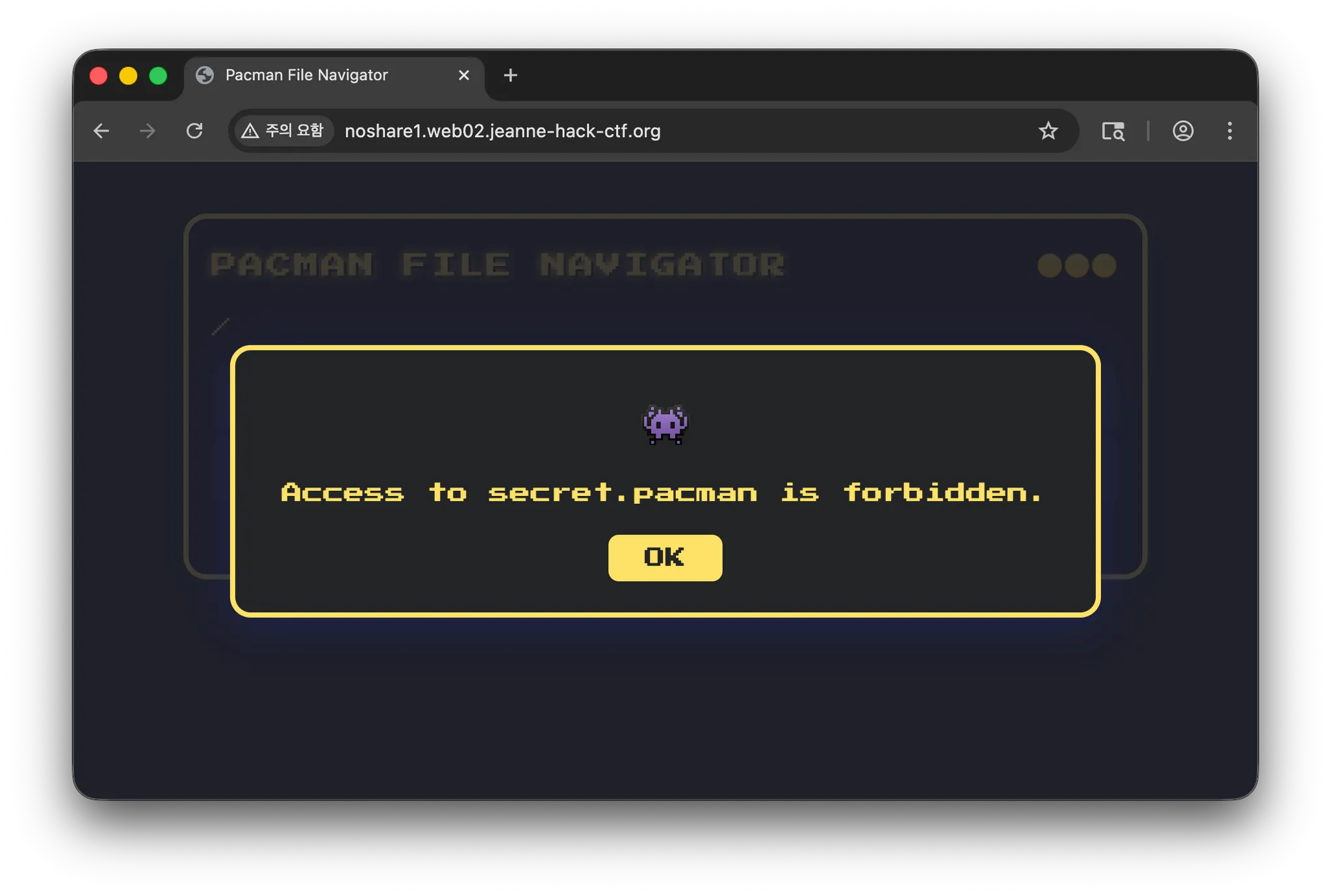 이중 public.pacman 경로는 다음과 같이 접근이 가능하지만 secret.pacman 은 접근이 거부되는 것을 확인할 수 있습니다.
