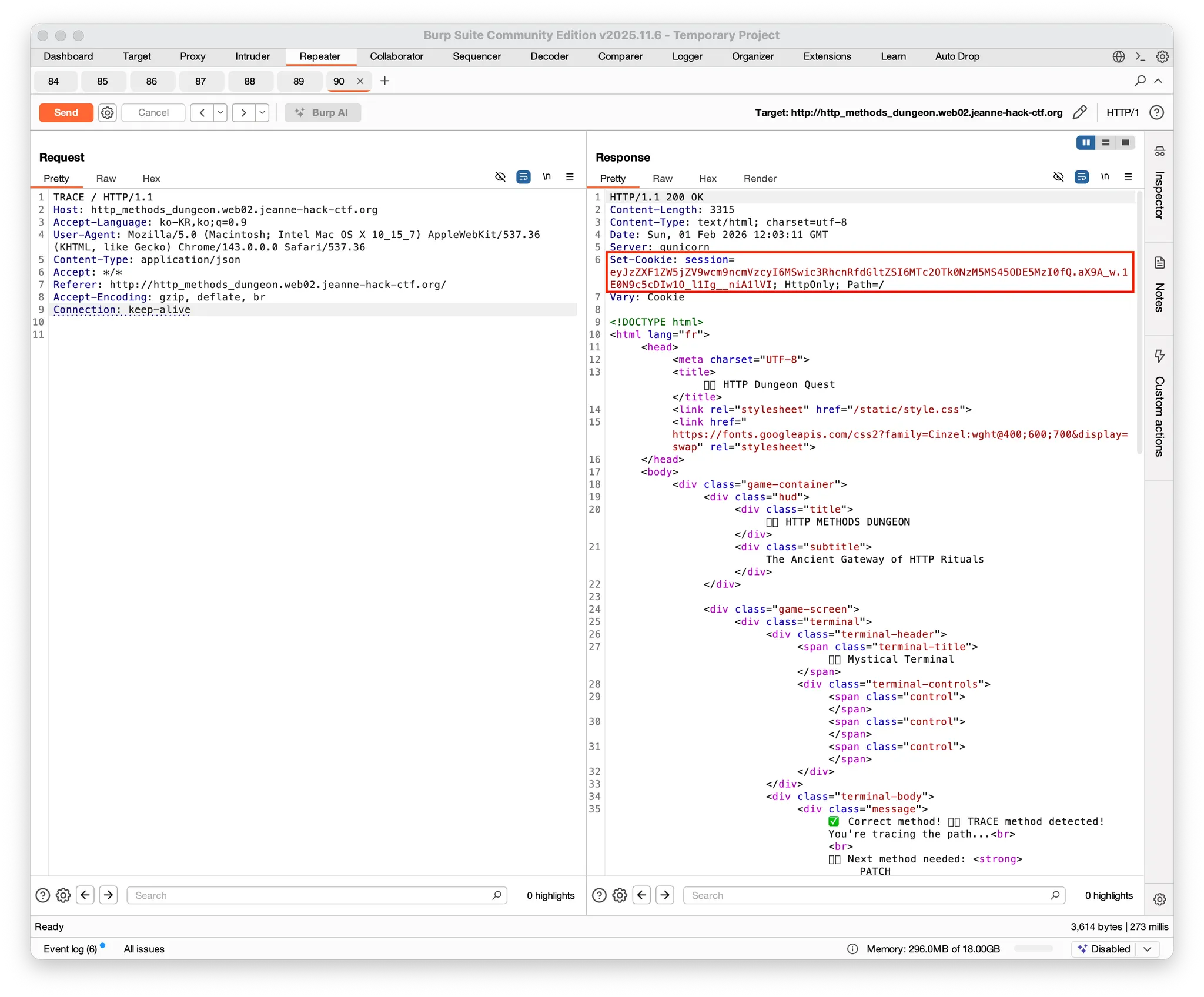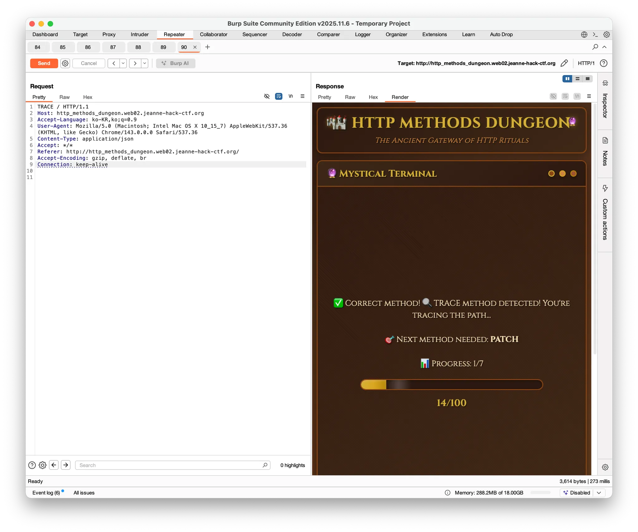 Burp Suite를 이용해서 각 HTTP Method를 요청하였고 이 중 첫 시작은 TRACE 메서드인 것을 확인했습니다.