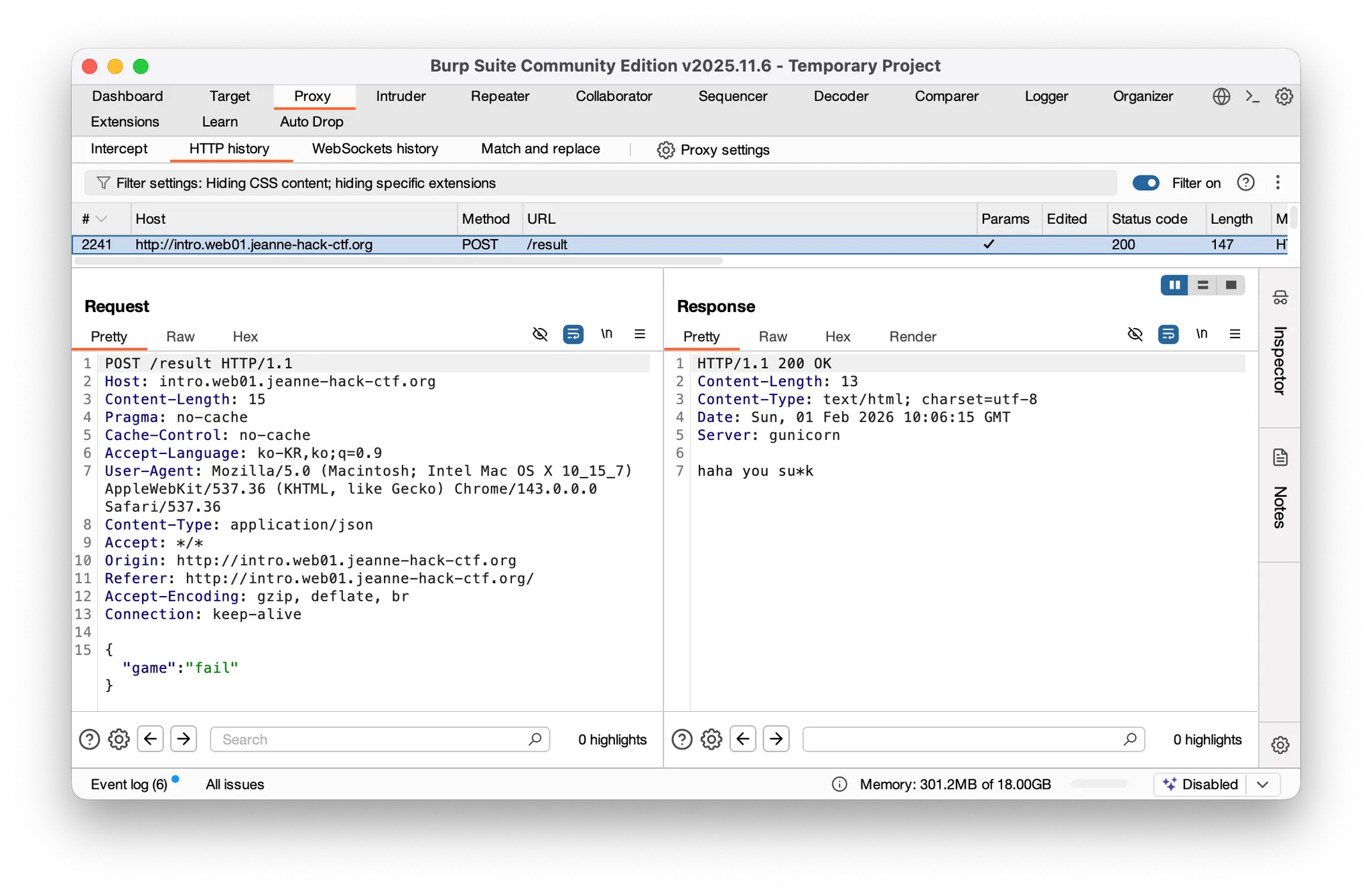 API /result 의 요청 데이터를 { "game": "win" } 으로 변경하여 요청을 수행한 결과 다음과 같이 응답데이터에서 플래그를 획득할 수 있었습니다.