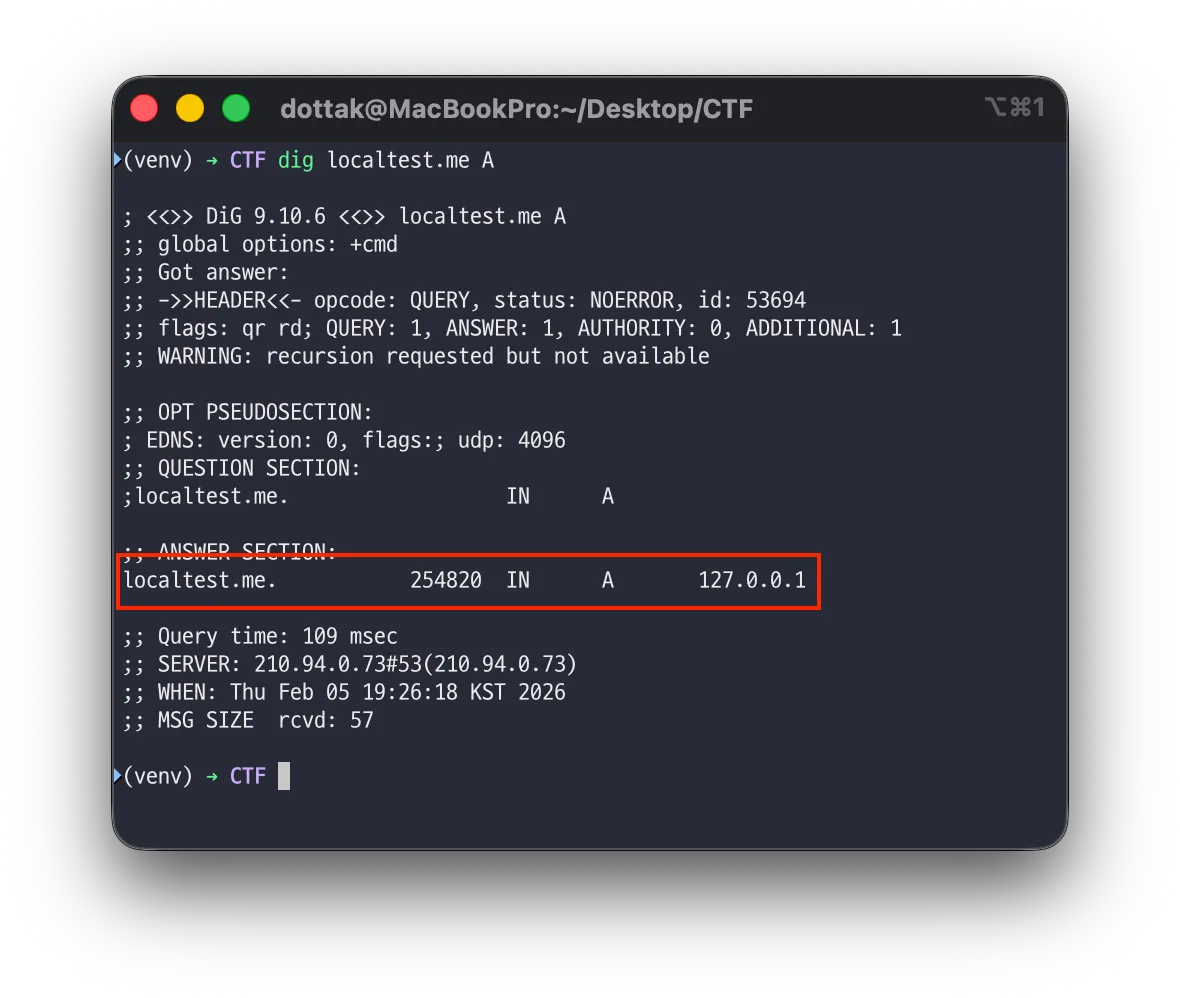 이 중 도메인 localtest.me 로 DNS A 레코드 질의를 수행하면 응답 데이터가 로컬호스트 IP 주소를 반환합니다.