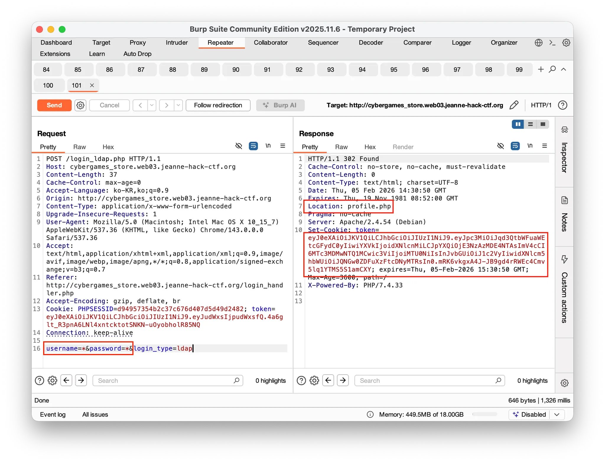 위 /login_ldap.php 요청이 LDAP와 관련되어 있으므로 LDAP Injection 페이로드인 와일드카드(*)를 삽입해봤습니다.