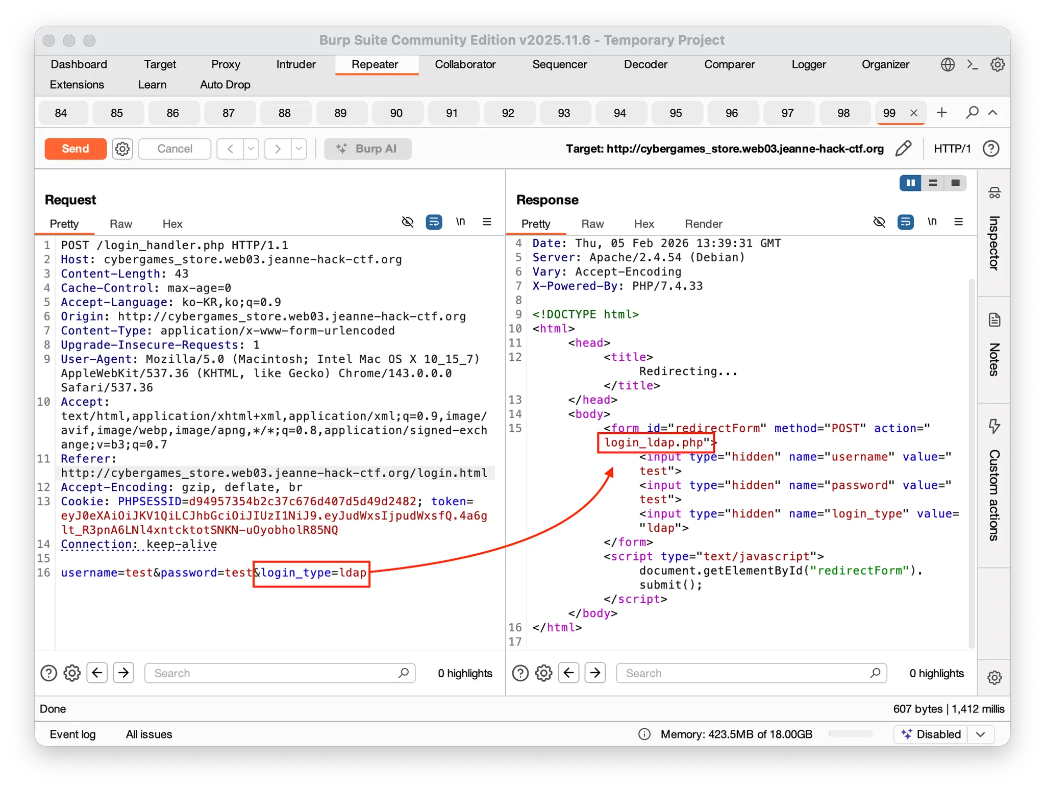 따라서, 로그인 요청은 API /login_handler.php 요청이 먼저 발생되고 이때 전달한 요청 데이터 login_type 에 따라 ‘classic’ 이면 /login_classic.php 요청이, ‘ldap’ 이면 /login_ldap.php 요청이 발생됨에 따라 해당 위치를 이용하여 푸는 것을 짐작할 수 있었습니다.