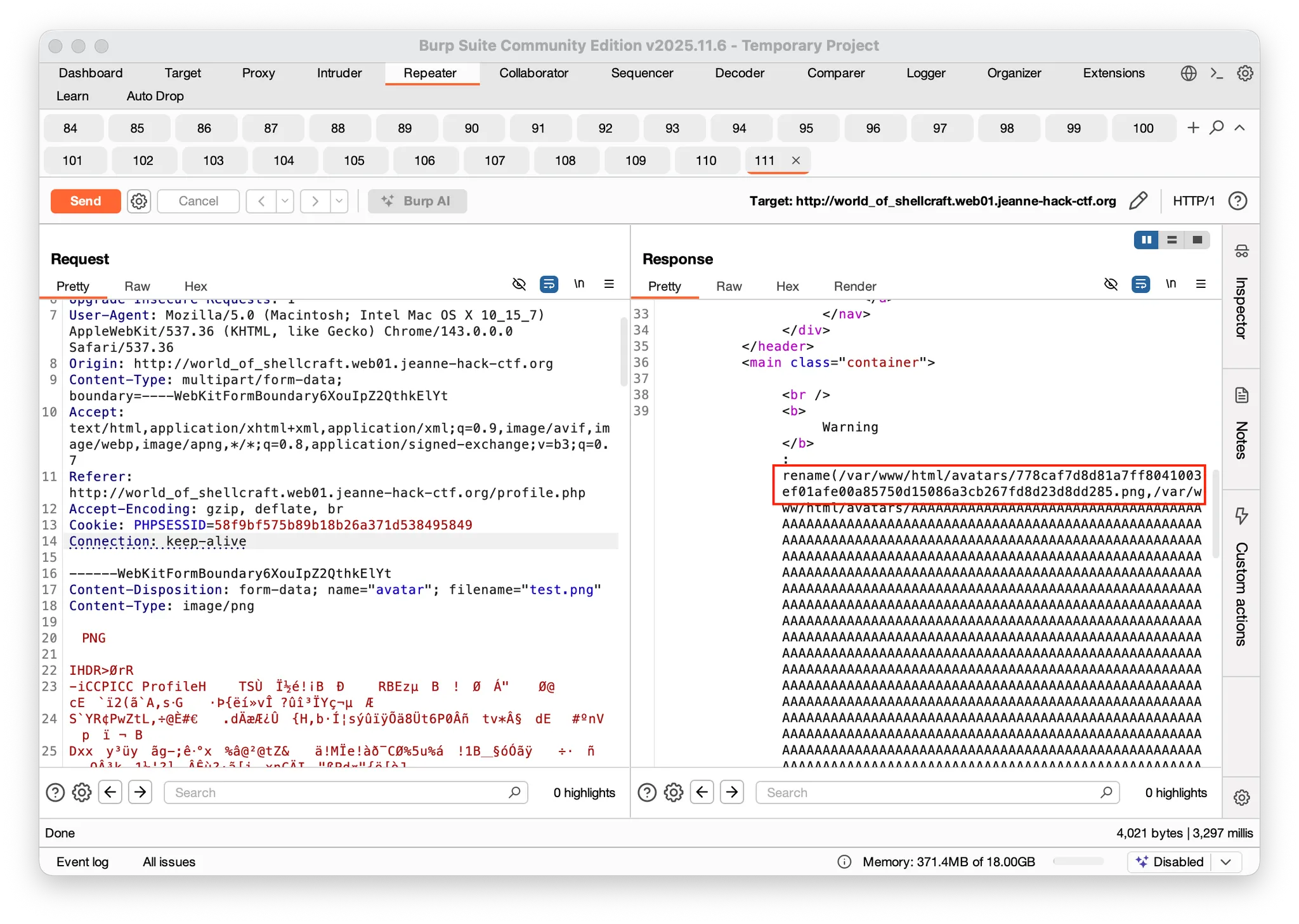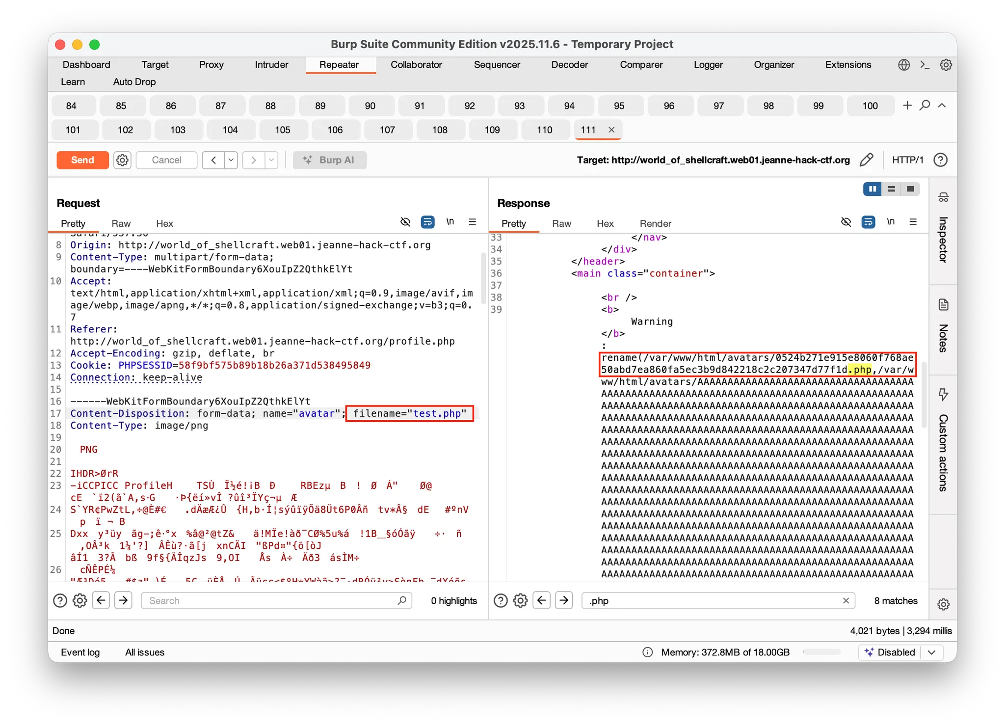 다만, 이때는 첫 번째 인자가 업로드한 파일의 확장자(.png)로 확인되는데, 이 값을 업로드할 때 filename 확장자를 .php 로 변경하여 요청을 수행하니 다음과 같이 첫 번째 인자에 .php 가 기록되는 것을 발견할 수 있었습니다.
