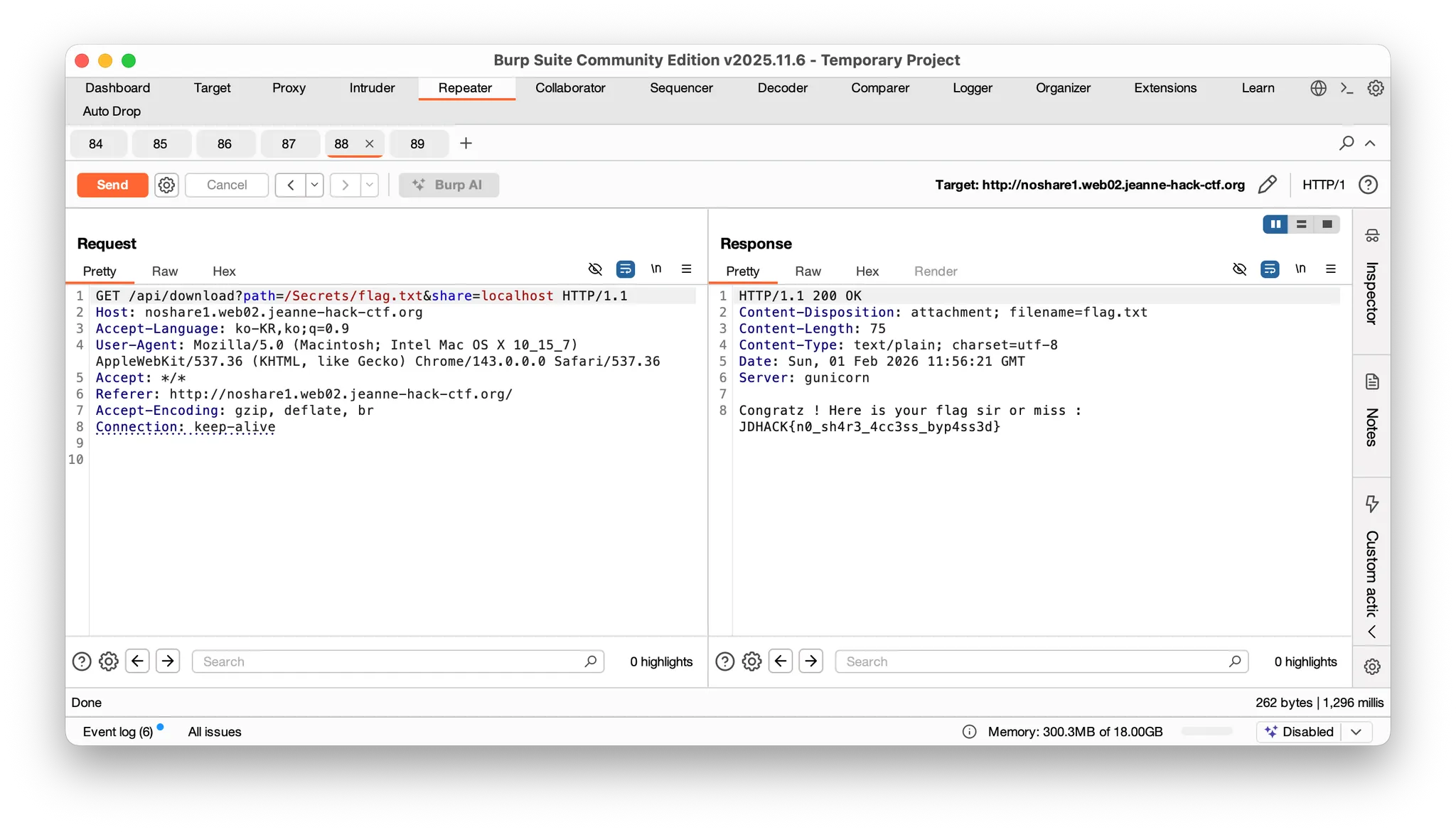 따라서, 접근 권한을 확인한 URL 파라미터 share 에 localhost 를 입력하면 정책을 우회할 수 있으며, URL 파라미터 path 에 절대경로를 작성하는 방식으로 접근을 할 수 있었습니다.