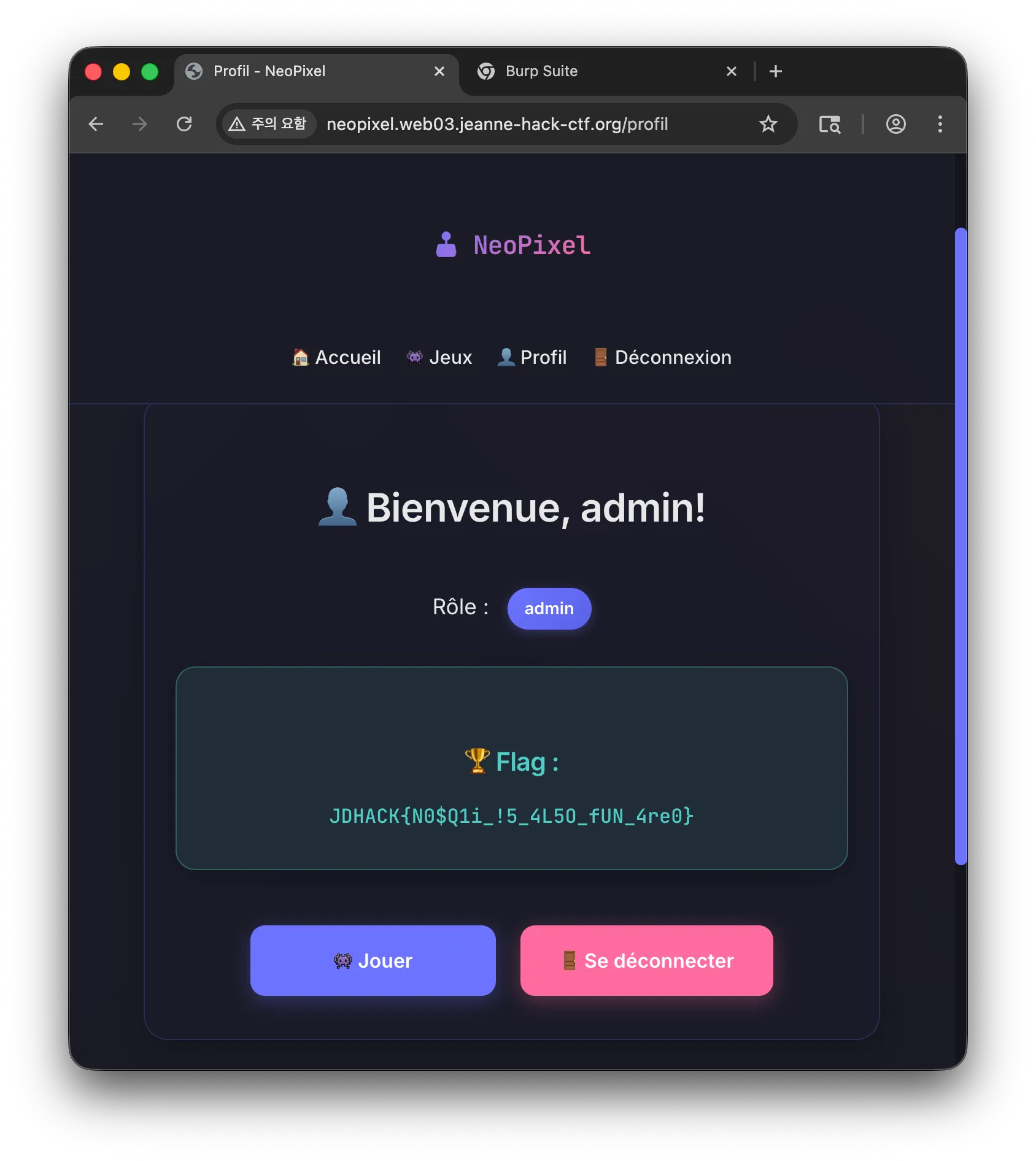 리다이렉트된 프로필 페이지(/profil)에서 플래그를 확인할 수 있었습니다.