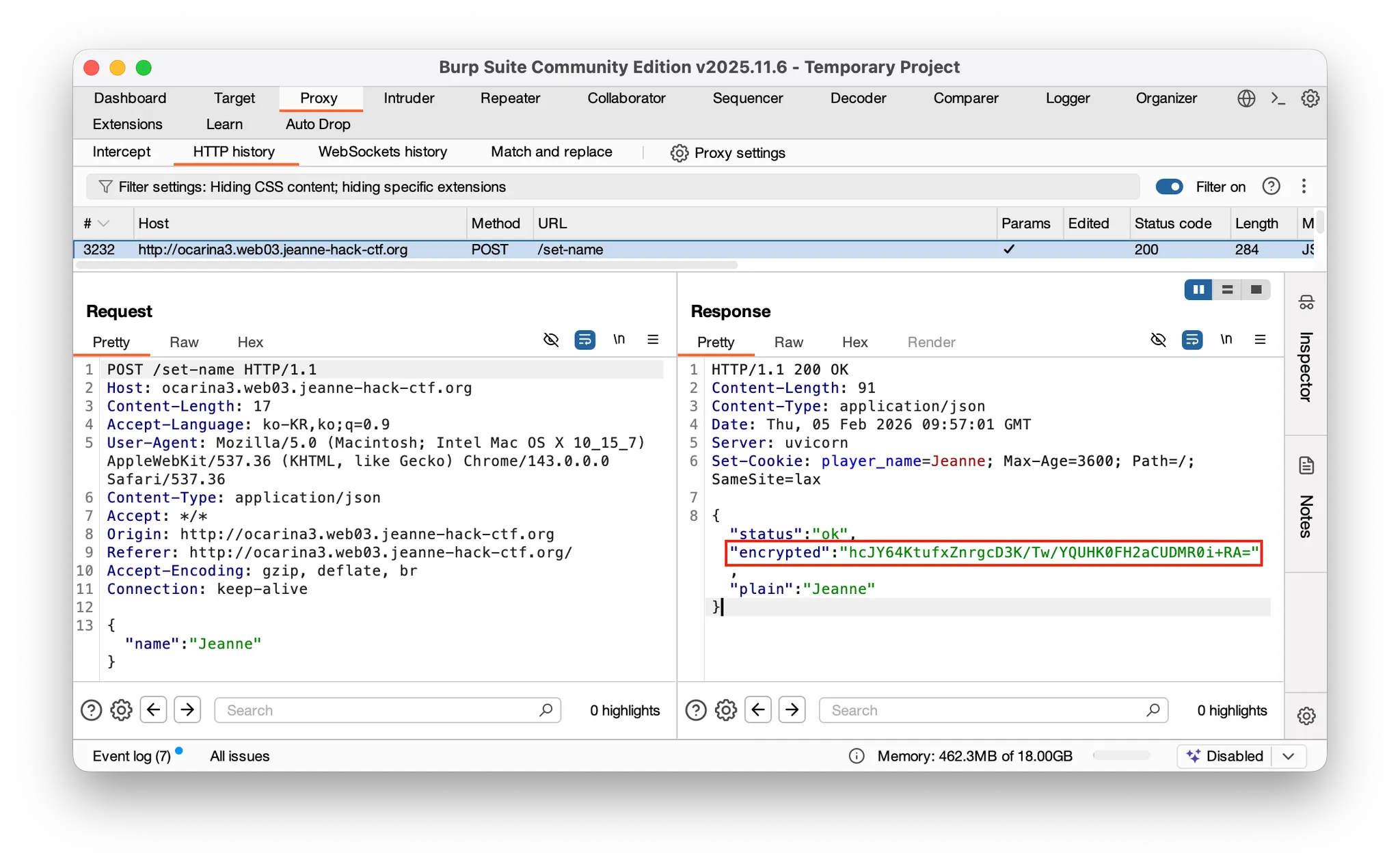 이 폼에서 ‘Save’ 버튼을 클릭하면 요청 데이터에는 입력한 값을 포함한 URL /set-name 요청 발생하고 응답 데이터에는 입력한 값에 대한 암호화된 데이터를 반환하는 것을 발견했습니다.